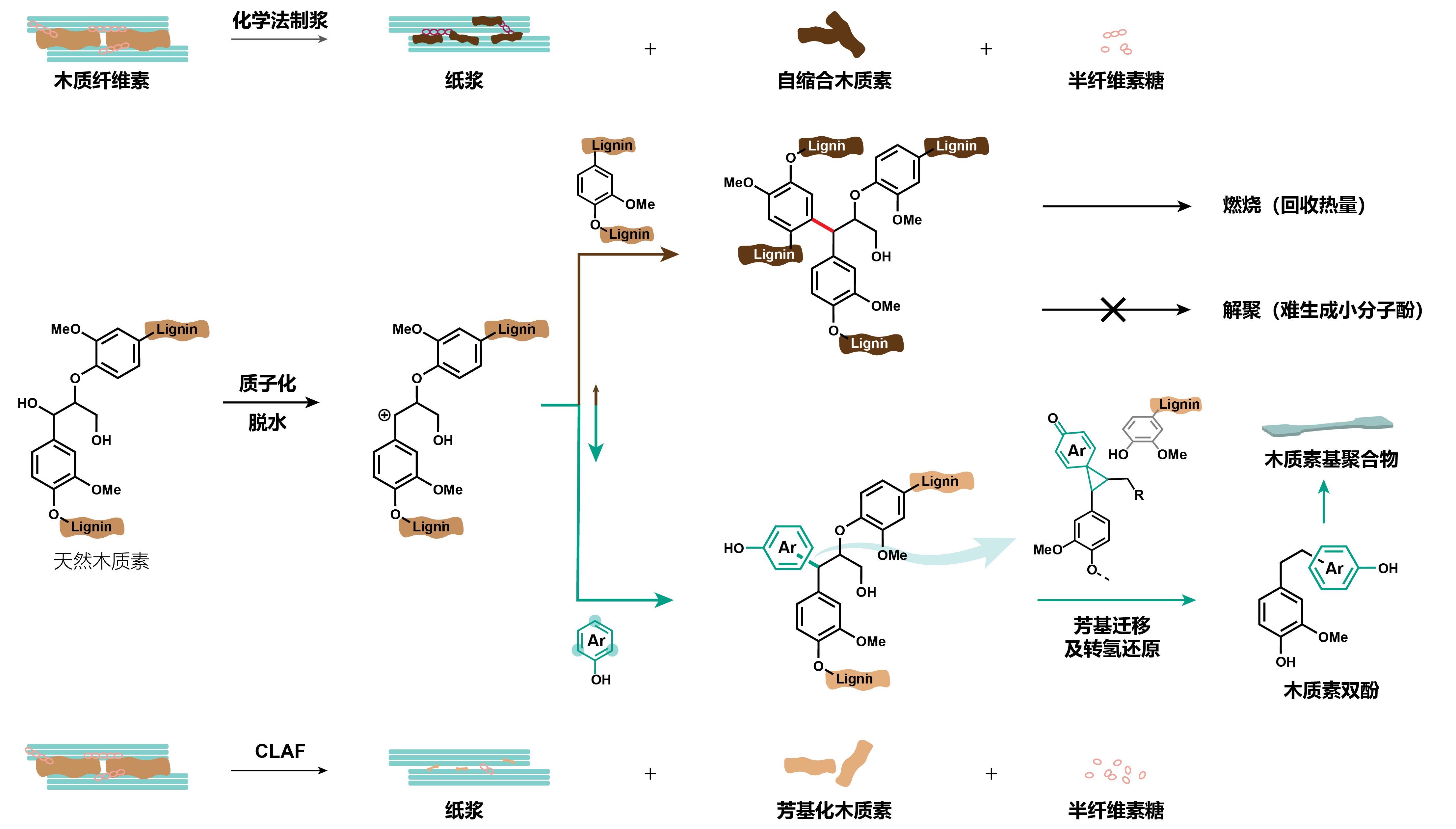 本工作中,王峰團隊重新思考了木質(zhì)素縮合反應的“弊”和“利”,認為利弊是相對的,不存在絕對有利的反應或者絕對有害的反應。木質(zhì)素發(fā)生自縮合反應從化學上可歸為芳基化反應,而芳基化反應本身并不是一件“壞事”,與其采用“堵”的方法抑制木質(zhì)素縮合,不如利用木質(zhì)素結構中存在自縮合反應位點的“優(yōu)勢”,解決芳基化反應選擇性的問題。因此,該團隊“因勢利導”地引入與木質(zhì)素結構類似且具有高親核活性的單酚化合物,在三素分離過程中,單酚與木質(zhì)素發(fā)生選擇性芳基化反應,阻止木質(zhì)素發(fā)生無序自縮合。木質(zhì)素芳基化改性后,溶解性顯著提高,可與纖維素、半纖維素組分高效分離,同時保留了自身活性芳基醚結構,更有利于后續(xù)催化解聚。