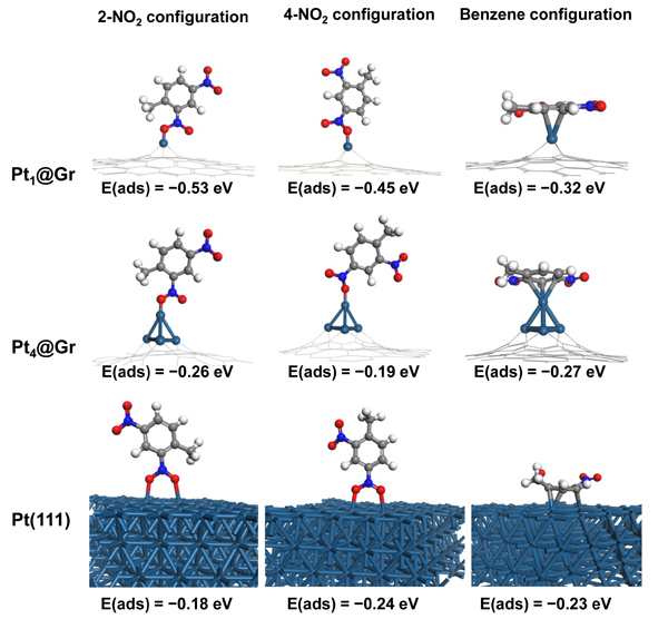 圖3. DFT計算。2,4-DNT在Pt1@Gr、Pt4@Gr和Pt(111)上三種可能的吸附模式(2-NO2-構(gòu)型、4-NO2-構(gòu)型和benzene-構(gòu)型)以及對應(yīng)的吸附能。