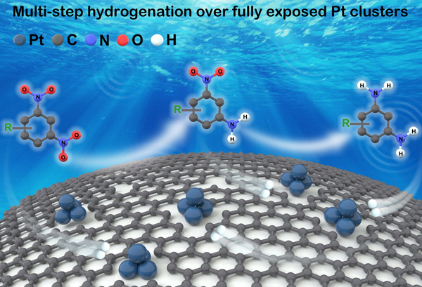 最近,中國科學(xué)院金屬研究所沈陽材料科學(xué)國家研究中心劉洪陽研究員、刁江勇副研究員和博士研究生司陽等人與北京大學(xué)馬丁教授、中國科學(xué)院山西煤化所溫曉東研究員、香港科技大學(xué)王寧教授等團隊合作,在富缺陷石墨烯載體表面精準(zhǔn)構(gòu)建了全暴露Ptn團簇催化劑,實現(xiàn)其高效催化2,4-二硝基甲苯多步加氫,并在亞納米尺度下系統(tǒng)理解2,4-二硝基甲苯加氫的金屬結(jié)構(gòu)的依賴性。近日,該研究成果在《自然-通訊》(Nature Communications) 在線發(fā)表。