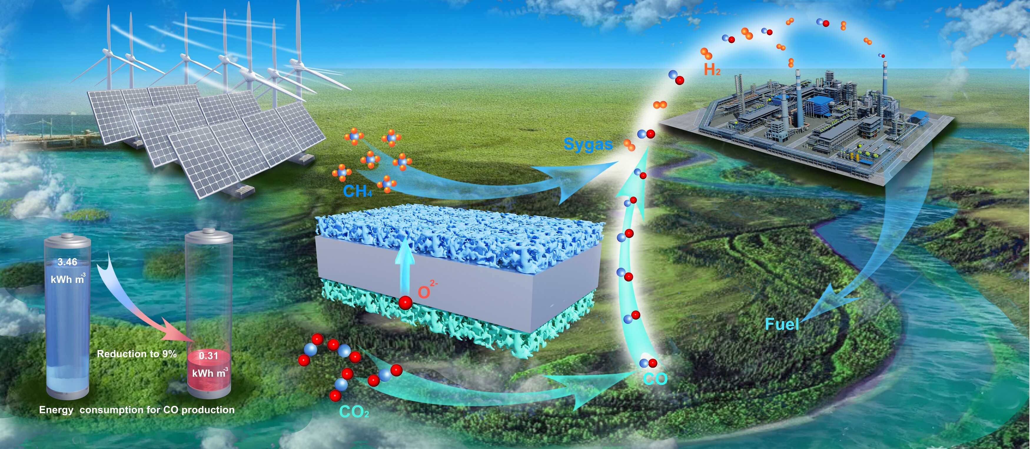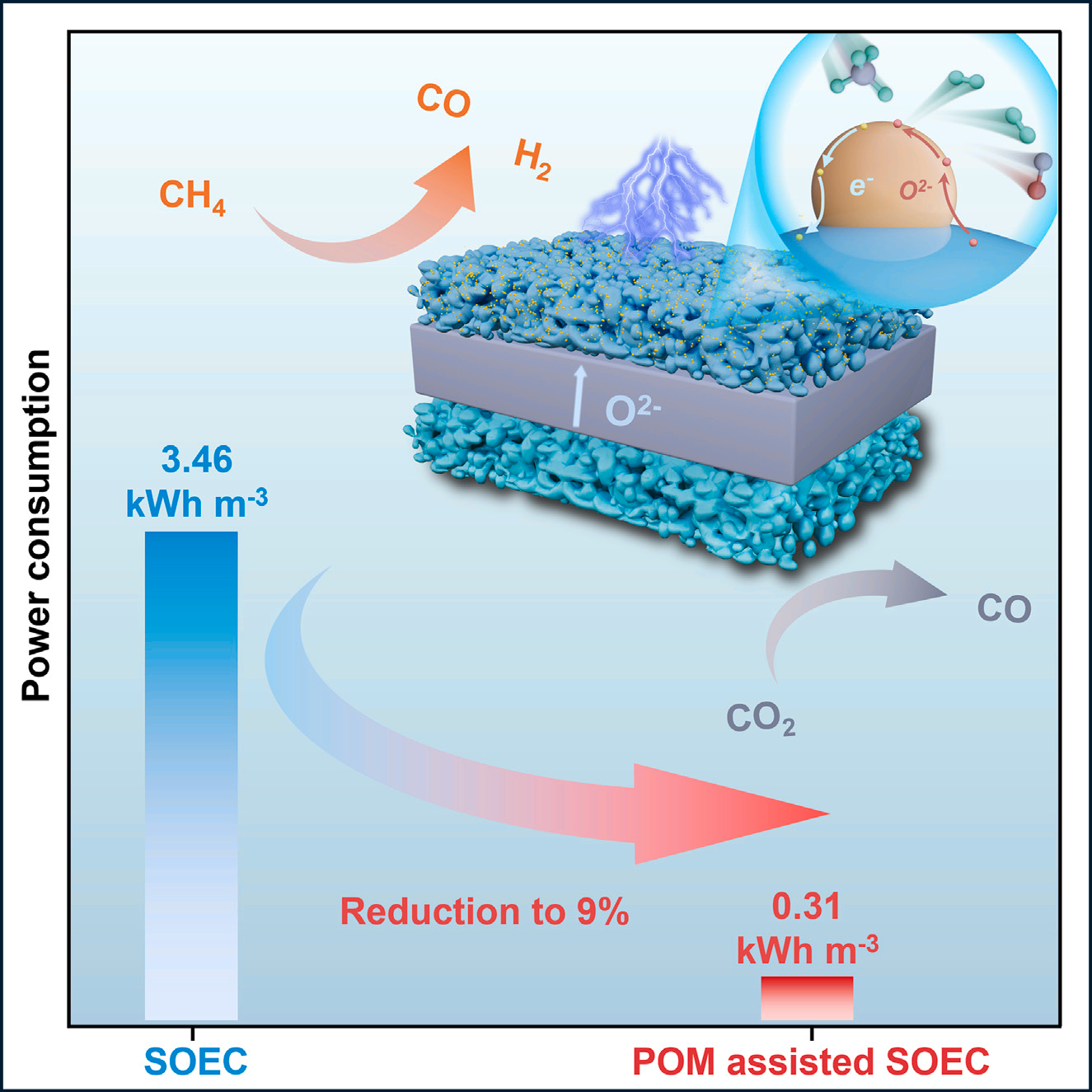 該團(tuán)隊長期致力于基于固體氧化物電解池的高溫電催化研究,前期利用原位溶出和高溫分散法開發(fā)出了一系列高活性電化學(xué)表界面,用于高溫電極反應(yīng)。本工作中,團(tuán)隊通過調(diào)控La0.6Sr0.4Ti0.3Fe0.7-xCoxO3- 陽極鈣鈦礦中B位Co\Fe比例,優(yōu)化B位過渡金屬溶出能,實現(xiàn)在La0.6Sr0.4Ti0.3Fe0.5Co0.2O3- (LSTFC2)鈣鈦礦表面原位溶出生成平均粒徑最小為7nm、顆粒密度最高為1087個 m-2的CoFe合金納米顆粒,為陽極CH4轉(zhuǎn)化提供了充足活性位點。研究還發(fā)現(xiàn),電驅(qū)動產(chǎn)生的溢流氧也可進(jìn)一步促進(jìn)甲烷吸附活化、抑制積碳形成,從而提升了陽極催化劑活性和穩(wěn)定性。800 C下,LSTFC2陽極CH4轉(zhuǎn)化率可達(dá)到86.9%,CO選擇性達(dá)到90.1%,連續(xù)穩(wěn)定運行1250 小時無顯著衰減。電化學(xué)性能測試表明,陽極引入甲烷半氧化重整反應(yīng)后,CO生產(chǎn)能耗從傳統(tǒng)SOEC的3.46 kWh/m3降低到0.31 kWh/m3。本工作為C1小分子升級轉(zhuǎn)化提供了新的研究思路。