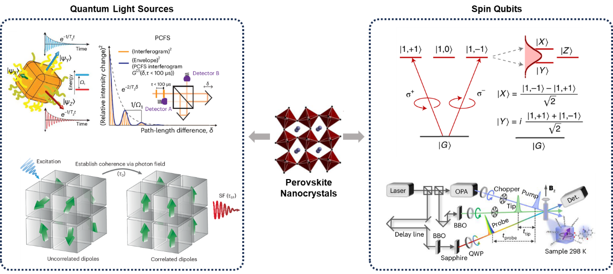 半導(dǎo)體納米晶(即量子點(diǎn))是發(fā)展量子信息技術(shù)的一類重要材料平臺(tái)。量子點(diǎn)具有限域效應(yīng)產(chǎn)生的精確量子能級(jí)結(jié)構(gòu)和強(qiáng)光學(xué)響應(yīng)行為,不僅能夠用作產(chǎn)生高品質(zhì)的單光子,還可以憑借其光生激子或載流子作為自旋比特,實(shí)現(xiàn)量子計(jì)算、量子通信與量子傳感等。相比于目前廣泛使用的外延生長(zhǎng)量子點(diǎn),膠體量子點(diǎn)在溫和條件下就能展現(xiàn)出顯著的量子特性,在合成制備以及器件組裝等方面也有著不可比擬的成本優(yōu)勢(shì)。但是,傳統(tǒng)的II-VI族膠體量子點(diǎn)由于表界面缺陷、暗態(tài)干擾以及較小的光學(xué)躍遷偶極矩等原因,長(zhǎng)期以來在單光子源和自旋量子比特操縱等重要領(lǐng)域面臨巨大挑戰(zhàn)。近年來出現(xiàn)的鈣鈦礦量子點(diǎn)則展現(xiàn)出了非常高效的光吸收和發(fā)射性能,有望成為一類新興的量子光源。此外,鈣鈦礦量子點(diǎn)較強(qiáng)的自旋-軌道耦合作用和巨大的躍遷偶極矩則大大降低了光學(xué)注入、操控和讀出自旋的難度,從而使其有望成為自旋量子比特的載體。