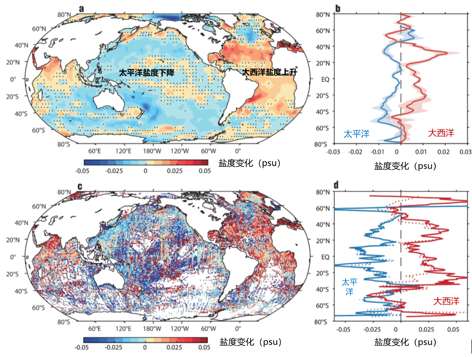 作為海水的基礎(chǔ)性質(zhì)之一,海洋鹽度是決定海洋層結(jié)和環(huán)流結(jié)構(gòu)的關(guān)鍵要素。在全球海洋鹽度的分布中,大西洋的高鹽度和太平洋的低鹽度之間形成了鮮明對比,很大程度上決定了這兩個大洋在水團性質(zhì)、環(huán)流結(jié)構(gòu)、氣候狀態(tài)和生物地球化學(xué)循環(huán)特征等方面的巨大差異,也潛在影響著它們對氣候變化的響應(yīng)和反饋方式。在氣候變暖背景下,海洋鹽度也發(fā)生著深刻變化,大西洋與太平洋的鹽度差異是加強還是減弱?會產(chǎn)生什么影響?當前氣候模式(如CMIP6)能否正確模擬這些變化?這些問題亟待解答。
