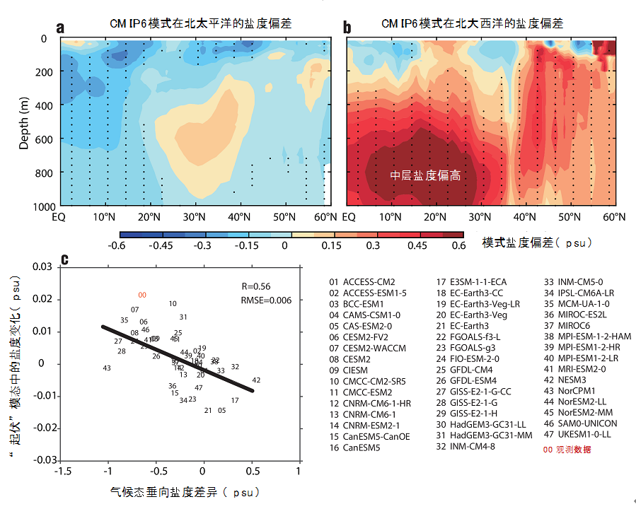 以往對鹽度變化的研究普遍強調(diào)表面淡水通量(即降水和蒸發(fā))的控制作用,并將海洋鹽度視為全球淡水循環(huán)變化的指示物。本研究通過熱力學(xué)模態(tài)分解(即分離“起伏”模態(tài)和“澀變”模態(tài))和LICOM3模式敏感性試驗,檢驗了各種物理過程對鹽度長期變化的貢獻。結(jié)果顯示,除了降水和蒸發(fā)之外,風場和海洋增暖也對大尺度鹽度變化趨勢具有重要作用。其中,風場的長期變化導(dǎo)致風生海洋環(huán)流變異,海洋表層變暖則導(dǎo)致水團的形成源地向高緯度遷移,這些過程顯著改變了鹽分在海洋中的空間分布,即“鹽度再分配”作用,從而在APSC加強趨勢及其經(jīng)向結(jié)構(gòu)的形成中發(fā)揮了關(guān)鍵作用。上述過程在大西洋和太平洋均有發(fā)生,但由于兩大洋氣候態(tài)鹽度分布(如水平和垂向鹽度梯度)的差異,產(chǎn)生了截然不同的作用結(jié)果。當前氣候模式(CMIP6)在鹽度變化的模擬中仍存在明顯偏差,普遍低估了大西洋鹽度的上升趨勢,這與模式對氣候態(tài)鹽度分布的模擬偏差有關(guān)(圖2)。大多數(shù)CMIP6模式模擬的大西洋表層鹽度偏低,中層鹽度偏高,因此嚴重低估了垂向鹽度梯度。這使得模式中海洋動力過程的鹽度再分配作用偏弱,因此低估了大西洋鹽度的升高趨勢。