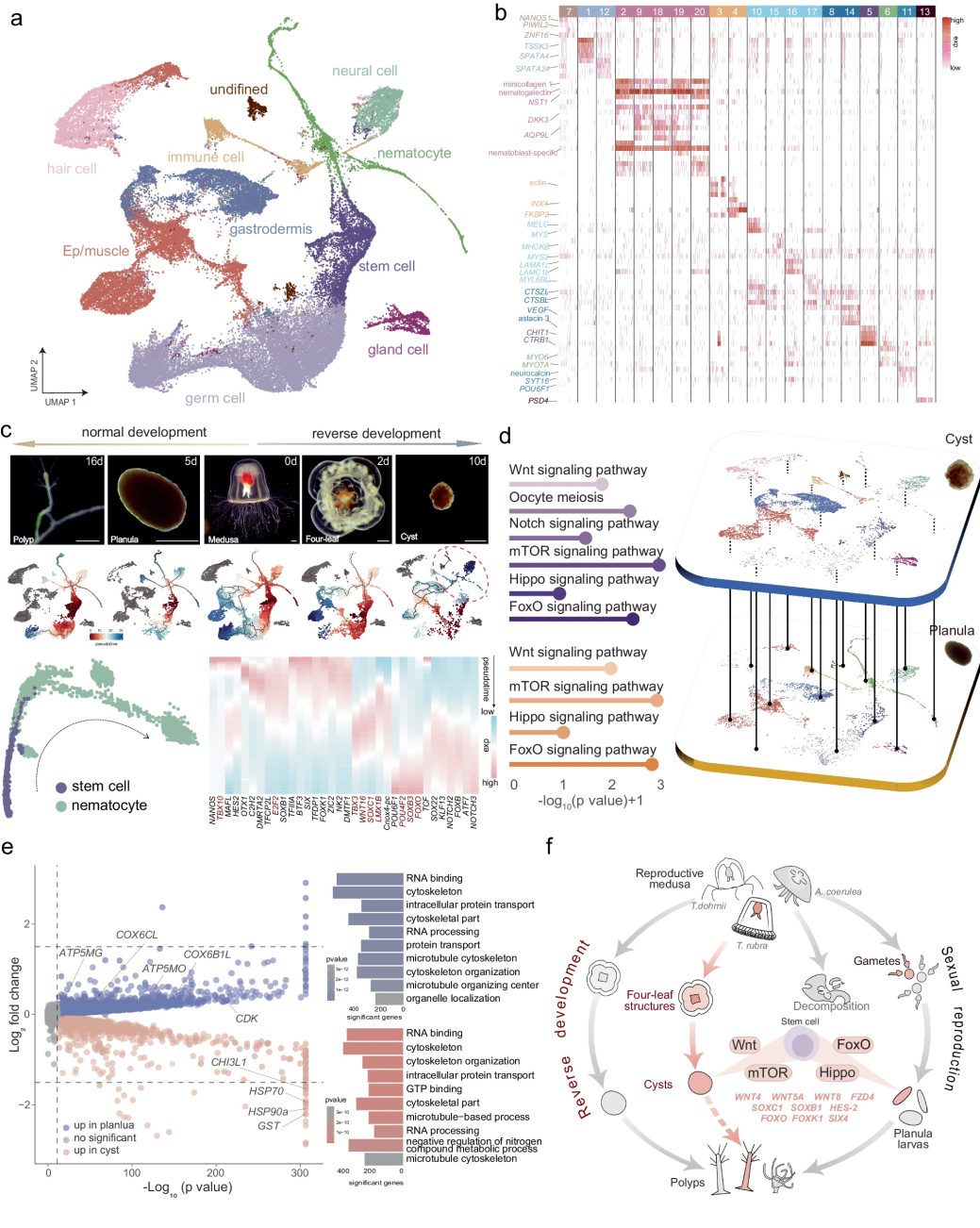 對燈塔水母五個發(fā)育階段的單細(xì)胞轉(zhuǎn)錄組分析表明,在逆向發(fā)育過程中,滯育相關(guān)基因在囊(cyst)階段顯著富集,持續(xù)的休眠狀態(tài)可能更有利于燈塔水母應(yīng)對不利環(huán)境。此外,該研究發(fā)現(xiàn)囊和浮浪幼體的基因表達(dá)模式具有相似性,囊階段干細(xì)胞及相關(guān)發(fā)育基因的表達(dá)也為囊在合適條件下重新萌發(fā)為新的水螅體提供細(xì)胞和遺傳基礎(chǔ)。