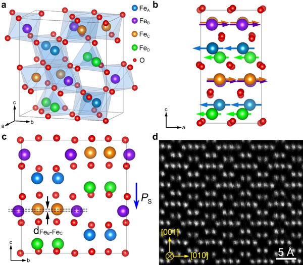圖1.(a) -Fe2O3的原子結(jié)構(gòu),(b) -Fe2O3的磁結(jié)構(gòu),(c) -Fe2O3的鐵電極化,(d) -Fe2O3相沿[1 00]方向的HAADF像。