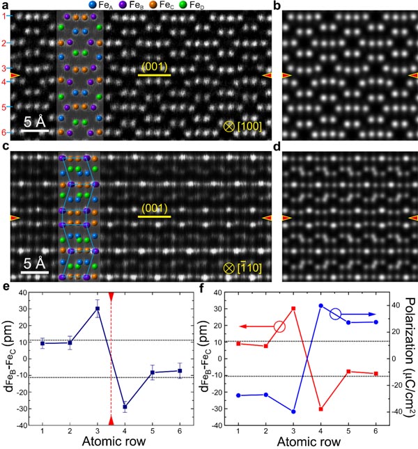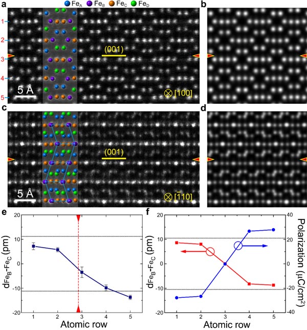 圖2. (a,c)I型疇壁分別沿[100]和[1 00]方向的HAADF像,(b,d)對(duì)應(yīng)的模擬HAADF像,(e)疇壁附近不同原子層的相對(duì)位移量,(f)計(jì)算得到的不同原子層的相對(duì)位移量和對(duì)應(yīng)的鐵電極化強(qiáng)度。I型疇壁處的鐵電極化強(qiáng)度顯著增強(qiáng)。