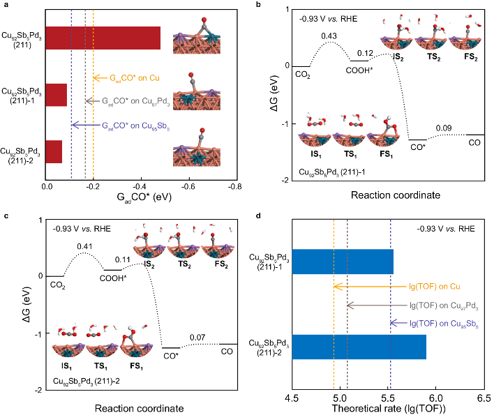 本工作中,肖建平團(tuán)隊探究了單原子合金催化劑Cu92Sb5Pd3電催化CO2還原表現(xiàn)出高CO選擇性的原因。研究發(fā)現(xiàn),Pd和Sb單原子的共摻雜作用,降低了Cu基催化劑的表面能,提高了Cu基催化劑穩(wěn)定性;改變了電荷分布,降低了d-band 中心,減弱了CO*的吸附,提升了CO的選擇性。通過電荷外插值法,肖建平團(tuán)隊計算了工作電勢下的CO2還原反應(yīng)的反應(yīng)能壘,并通過微觀動力學(xué)模擬得到了CO*覆蓋度、CO法拉第效率,模擬結(jié)果與實驗結(jié)果有較好的吻合。該研究為設(shè)計高活性和特定選擇性電催化材料提供了新思路。