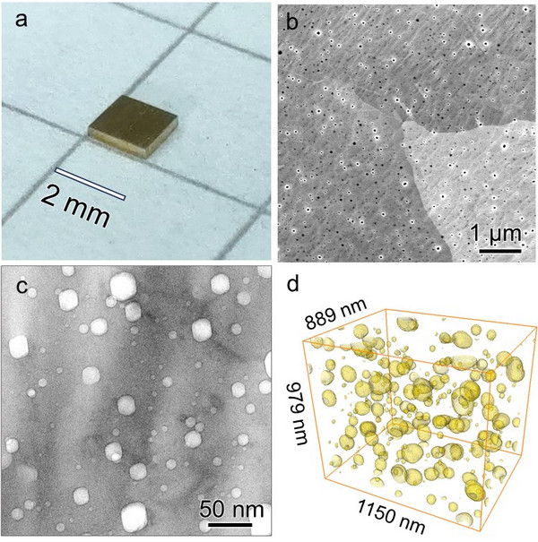 圖1. 納米孔彌散強化金(NVD Au):(a)樣品實物圖;(b)典型掃描電鏡照片;(c)透射電鏡照片;(d)三維重構圖顯示納米孔的空間分布。