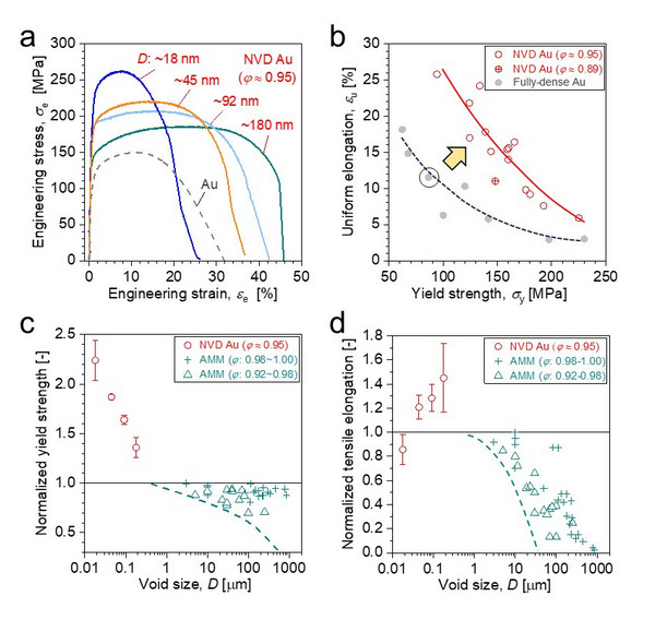 圖2. 納米孔彌散強化金(NVD Au)的力學行為:(a) 不同孔徑NVD Au以及全致密參比樣品的拉伸曲線;(b)兩種樣品均勻延伸率隨屈服強度的變化;(c)屈服強度和(d)均勻延伸率隨孔徑的變化規(guī)律。AMM: 增材制造金屬材料。屈服強度和均勻延伸率均以相應全致密態(tài)樣品數據為基準進行了歸一化。