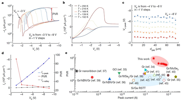 a. 輸出特性曲線;b. 輸出特性中電流的溫度依賴(lài)性;c. 峰值電流偏壓與縫隙寬度關(guān)系圖;d. 峰谷電流比;e. 峰谷電流比性能對(duì)比圖。