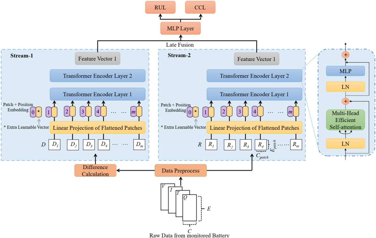 該研究提出了基于少量充電周期數據的深度學習模型。這一模型通過帶有雙流框架的Vision?? Transformer結構和高效自注意力機制,捕捉并融合多時間尺度隱藏特征,實現對電池當前循環(huán)壽命和剩余使用壽命的準確預測。同時,該模型在使用15個充電周期數據的情況下,將剩余使用壽命和當前循環(huán)壽命的預測誤差分別控制在5.40%和4.64%以內。此外,在面對訓練數據集未出現的充電策略時,該模型仍能夠保持較低的預測誤差,證明了其zero-short泛化能力。