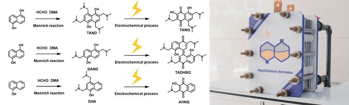 本工作中,為合成低成本、高穩(wěn)定性的有機(jī)活性分子,李先鋒和張長昆團(tuán)隊(duì)以大宗性化學(xué)品羥基萘作為底物,采用化學(xué)合成和電化學(xué)合成相結(jié)合的制備策略,制備出多取代基修飾的萘醌活性分子。該方法簡單高效,無需復(fù)雜的分離純化過程,簡化了合成步驟的同時(shí)降低了成本。此外,團(tuán)隊(duì)通過原位核磁共振和離線液質(zhì)聯(lián)用等譜學(xué)方法分析了不同結(jié)構(gòu)衍生物的電化學(xué)反應(yīng)機(jī)理。結(jié)果表明,在電化學(xué)氧化階段,萘衍生物羥基對位側(cè)的芐胺官能團(tuán)離去,并與水反應(yīng)氧化生成萘醌,進(jìn)一步與水加成生成多取代的萘醌活性分子。理論計(jì)算和實(shí)驗(yàn)結(jié)果表明,二甲胺官能團(tuán)提高了萘醌分子的溶解性的同時(shí)對分子活性中心起到保護(hù)作用,從而提升了高濃度電解液的穩(wěn)定性。研究團(tuán)隊(duì)進(jìn)一步采用一體化裝置將萘活性分子的合成過程進(jìn)行放大,單次可制備5千克萘衍生物分子,并進(jìn)行了電堆穩(wěn)定性測試。