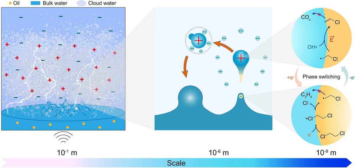 基于前期對帶電微液滴氧化還原反應(yīng)的研究,本工作中,團(tuán)隊在封閉環(huán)境中通過超聲驅(qū)動水在微液滴、水汽,以及體相之間快速轉(zhuǎn)變,制備出具有交流電壓的人造云,并以此實現(xiàn)了二氯乙烷的電化學(xué)選擇性脫氯反應(yīng)。研究人員通過云水中的電壓和電流測量證實,尺寸較大的微液滴帶正電,水汽中尺寸較小的亞微米液滴帶負(fù)電,并且兩種液滴具有不同的擴(kuò)散行為和空間分布。研究發(fā)現(xiàn),通過封閉環(huán)境限制亞微米液滴的擴(kuò)散空間,可以增強(qiáng)液滴之間的起電和放電作用。電子順磁共振譜(EPR)表征進(jìn)一步確認(rèn)了電子轉(zhuǎn)移參與了液滴的起電和放電過程,導(dǎo)致體相表面富集氫自由基,而微液滴富集羥基自由基。進(jìn)一步,團(tuán)隊通過EPR、液相色譜-高分辨率質(zhì)譜、氣相色譜等表征方法證明,水中的二氯乙烷首先在體相表面附近發(fā)生還原脫氯,生成氯乙基自由基中間體,隨后,該中間體隨著霧化過程進(jìn)入微液滴,并在其中加速氧化脫氫,生成氯乙烯。由于水在微液滴、水汽以及體相之間快速轉(zhuǎn)變,避免了反應(yīng)物和中間體的擴(kuò)散限制,可顯著提高超聲霧化作用下氯乙烯的生成速率和選擇性,相比超聲空化作用,超聲霧化作用的速率提升兩個數(shù)量級,氯乙烯在C2氣體產(chǎn)物中的選擇性最高可達(dá)80%左右。利用上述工作提出的借助微液滴體系,可有望實現(xiàn)對有機(jī)氯廢水的升級利用。