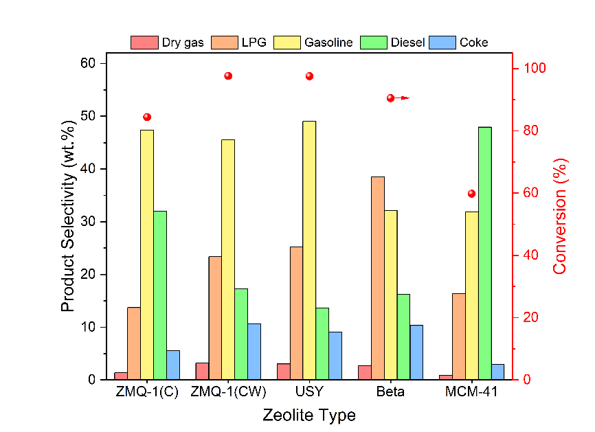 此外,ZMQ-1分子篩具有高的熱和水熱穩(wěn)定性、豐富的中強(qiáng)B酸位點(diǎn)。在重油催化裂化反應(yīng)中,與商業(yè)化沸石分子篩催化劑相比,含磷ZMQ-1沸石分子篩表現(xiàn)出對(duì)輕質(zhì)燃料(汽油和柴油)較高的選擇性,并且產(chǎn)生的焦炭、液化石油氣和干氣等產(chǎn)物也較少(圖2)。這一新型沸石分子篩的成功制備,為分子篩材料領(lǐng)域的發(fā)展提供了新的思路和方向。其獨(dú)特的介孔結(jié)構(gòu)和穩(wěn)定的化學(xué)性質(zhì)有望在大尺寸分子催化轉(zhuǎn)化和吸附分離工業(yè)應(yīng)用中發(fā)揮重要作用。