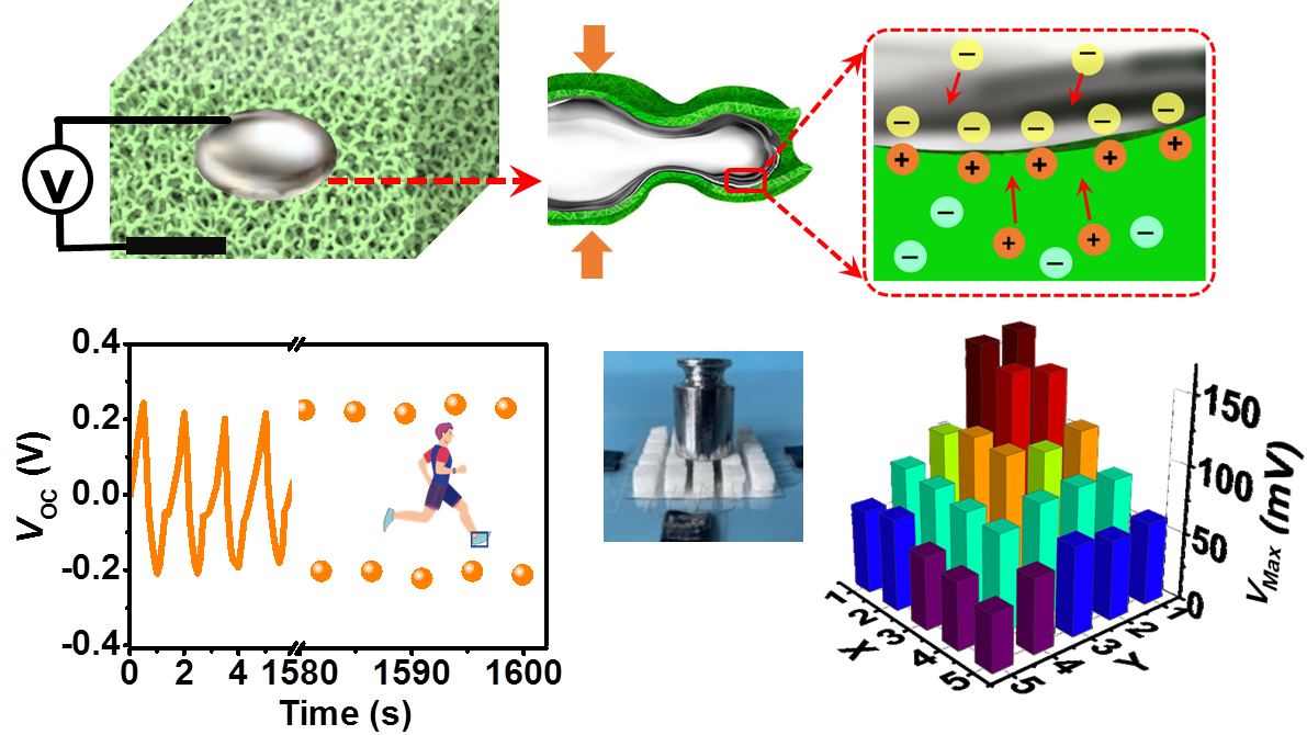 基于液態(tài)金屬與多孔離子凝膠動態(tài)雙電層的機械能產(chǎn)電機制及功能示意圖