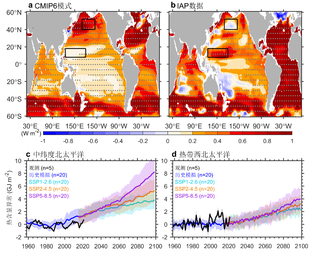 溫室氣體排放導(dǎo)致的地球系統(tǒng)能量增加中有90%以上被海洋吸收,但海洋熱量存儲在地理上并不均勻,對區(qū)域氣候和人類社會產(chǎn)生了廣泛影響。第六次國際氣候模式比較計劃CMIP6表明中緯度北太平洋的熱量存儲顯著增加,熱帶西北太平洋的儲熱變化最弱(圖1a)。然而,觀測到的北太平洋熱存儲格局更加復(fù)雜,與CMIP6集合平均呈現(xiàn)明顯差異(圖1),在熱帶西北太平洋具有最強變暖,在中緯度北太平洋變暖有限甚至變冷。由于CMIP6集合平均主要表示外強迫變化,北太平洋熱存儲格局的模擬-觀測差異可能源于模式對外強迫驅(qū)動的熱存儲存在系統(tǒng)模擬偏差,或者源于自然變率主導(dǎo)觀測的熱存儲格局。