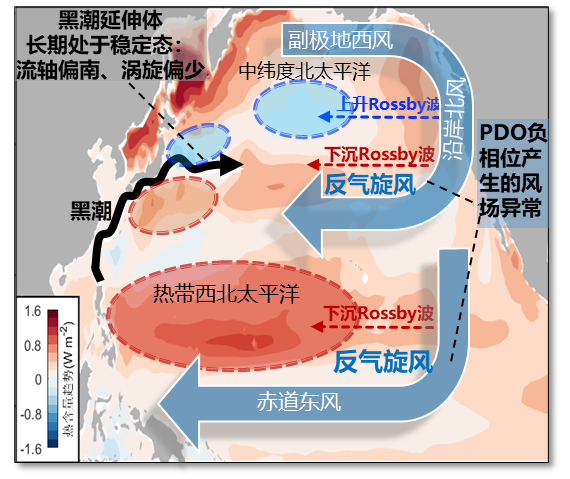 圖2?太平洋年代際振蕩PDO主導(dǎo)北太平洋熱量存儲格局的機制示意圖