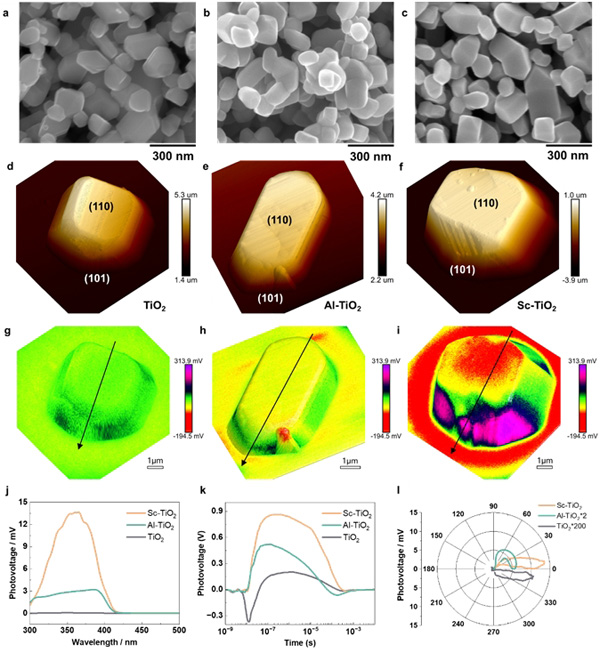 針對該難題,中國科學院金屬研究所沈陽材料科學國家研究中心劉崗團隊提出了基于低價金屬摻雜協(xié)同調(diào)控體相缺陷和暴露特定晶面實現(xiàn)光生電荷高效利用的研究策略。具體地,選取與Ti元素在元素周期表上相鄰的Sc為摻雜元素。在材料的體相,一方面Sc3?離子的半徑與Ti3?離子接近,因此Sc部分取代Ti原子后并不會帶來晶格畸變等缺陷;另一方面Sc的穩(wěn)定價態(tài)為+3價,與缺陷態(tài)的Ti3?價態(tài)相同,因此基于電荷平衡和Sc與氧空位的相互作用,就實現(xiàn)了對Ti3?的有效消除(圖1)。TiO?的表面與體相不同,Ti和O元素都是以不飽和配位的狀態(tài)存在,不飽和配位數(shù)是與所暴露的晶面直接相關的,表面Ti元素的配位數(shù)越低,表面能越高,越不穩(wěn)定,在制備過程中越不容易得到。而在Sc摻雜的TiO?中,Sc與氧空位總是共存的特性使得Sc周圍本身所需要的氧原子就相對較少。因此表面Ti原子被Sc替代后,將極大降低高能晶面的表面能,這樣就可以制備得到{101}晶面暴露的金紅石TiO??;诖耍芯繄F隊就制備得到了{101}與{110}晶面同時存在的二氧化鈦。打破了材料表面的對稱性,并且在兩個晶面間存在約1kV/cm的電場,該電場的強度與p-n結型太陽能電池的體相電場基本相當(圖2)。