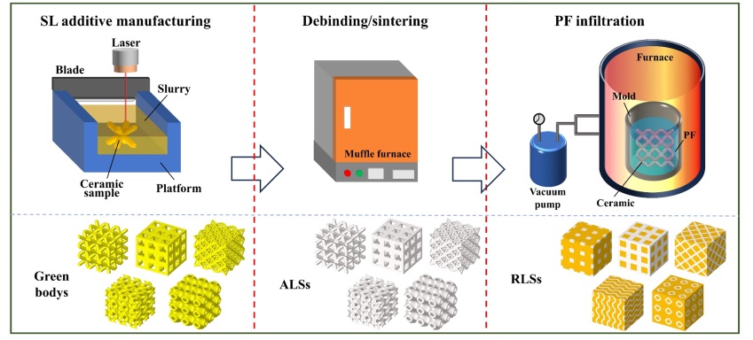 近日,中國科學(xué)院沈陽自動(dòng)化研究所通過基于立體光刻的增材制造技術(shù)與樹脂滲透工藝,設(shè)計(jì)并制備了一種氧化鋁陶瓷晶格與酚醛樹脂復(fù)合的新型增強(qiáng)晶格結(jié)構(gòu)(以下稱陶瓷點(diǎn)陣-樹脂復(fù)合結(jié)構(gòu)),這一新型增強(qiáng)晶格結(jié)構(gòu)兼具陶瓷材料的高強(qiáng)度、高模量和樹脂材料的高韌性,可實(shí)現(xiàn)優(yōu)異力學(xué)性能與輕量化的結(jié)合。
