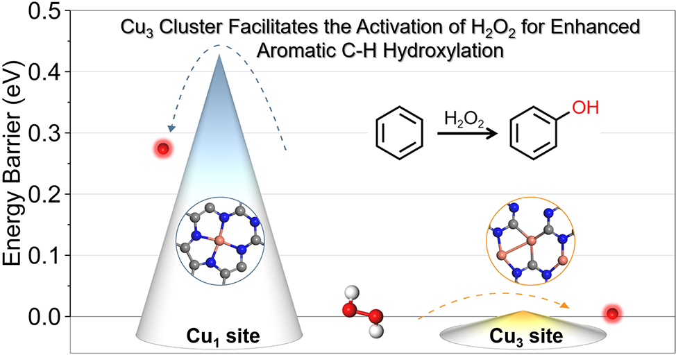 在催化科學領域,單原子催化劑因其獨特的催化潛力受到廣泛關注,但其本征質量活性受限,制約了其實際應用。為應對這一難題,青島能源所團簇化學與能源催化研究組基于少原子團簇催化劑精準可控的結構及金屬聚集效應等優(yōu)勢,通過原子級活性位點的設計與多原子協(xié)同作用的調控,成功構建了氮化碳負載銅原子簇催化劑(Cu3/CN),在苯選擇氧化制苯酚反應中展現(xiàn)出優(yōu)異的催化性能(圖1)。研究團隊系統(tǒng)的結合原位/非原位表面分析研究,明確了銅位點吸附氧物種(Cu=O*)在C-H鍵活化中的關鍵作用。密度泛函理論(DFT)計算表明,相較于孤立的Cu1位點,Cu3原子簇的d帶中心位置更高,且與H2O2分子間存在更強的電荷轉移作用。這種顯著的電荷轉移效應促使H2O2分子中O-O鍵拉伸,有效促進了Cu=O*活性物種的形成。