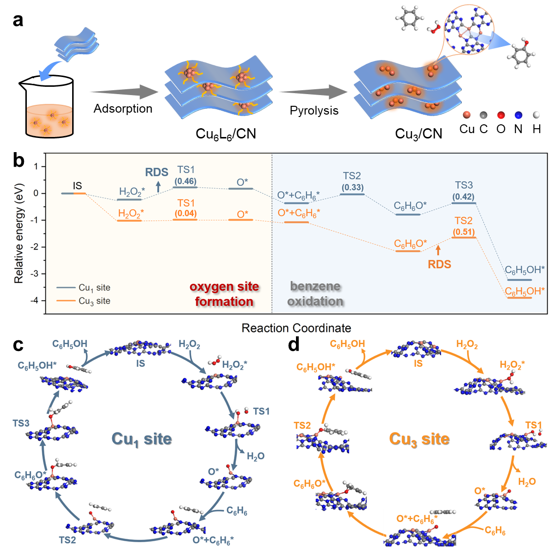 圖2(a)Cu3團簇催化劑的制備流程示意圖(b-d)苯氧化制苯酚反應路徑及相應的能量圖
