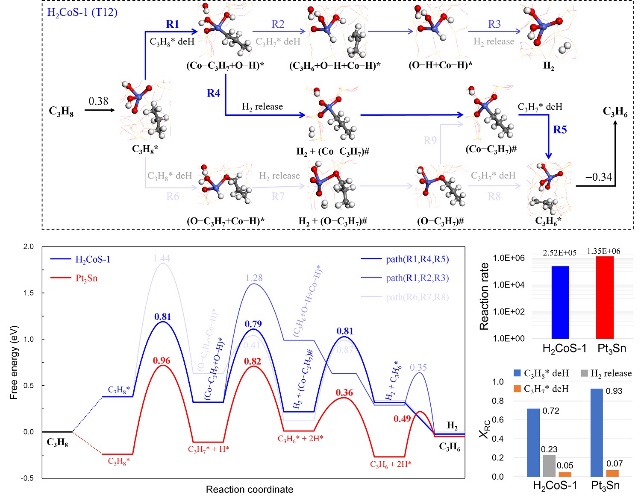 近日,大連化物所能源催化轉(zhuǎn)化全國重點實驗室計算和數(shù)據(jù)驅(qū)動催化研究組(511組)肖建平研究員團隊與浙江大學王亮研究員、肖豐收教授團隊,以及寧夏大學劉晰教授團隊合作,在丙烷脫氫制丙烯的研究中取得新進展,開發(fā)出一種鈷硅酸鹽沸石催化劑(CoS-1),該催化劑具有獨特的分子篩骨架穩(wěn)定孤立四面體鈷位點結(jié)構(gòu),展現(xiàn)出優(yōu)異的催化性能,可實現(xiàn)丙烯產(chǎn)率達9.7 kgC3=?kgcat–1?h–1。此外,在工業(yè)條件下,其丙烷脫氫性能優(yōu)于傳統(tǒng)工業(yè)PtSn/Al2O3催化劑。