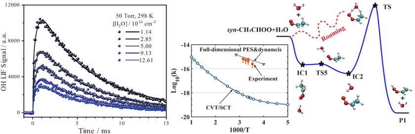本工作中,研究團隊采用自主研發(fā)的高重頻時間分辨激光誘導(dǎo)熒光技術(shù),結(jié)合基于基本不變量-神經(jīng)網(wǎng)絡(luò)方法構(gòu)建的高精度全維(27維)勢能面與動力學計算,發(fā)現(xiàn)syn-CH3CHOO與H2O的反應(yīng)速率常數(shù)比先前傳統(tǒng)理論預(yù)測的最大值高出約兩個數(shù)量級。這一加速效應(yīng)源于反應(yīng)入口通道中復(fù)雜中間體結(jié)構(gòu)和強長程偶極-偶極相互作用導(dǎo)致的“漫游機理”。研究表明,在典型大氣環(huán)境(相對濕度50%)下,syn-CH3CHOO與水蒸氣的雙分子反應(yīng)對其總消耗的影響程度與生成OH自由基的單分子分解途徑相當。