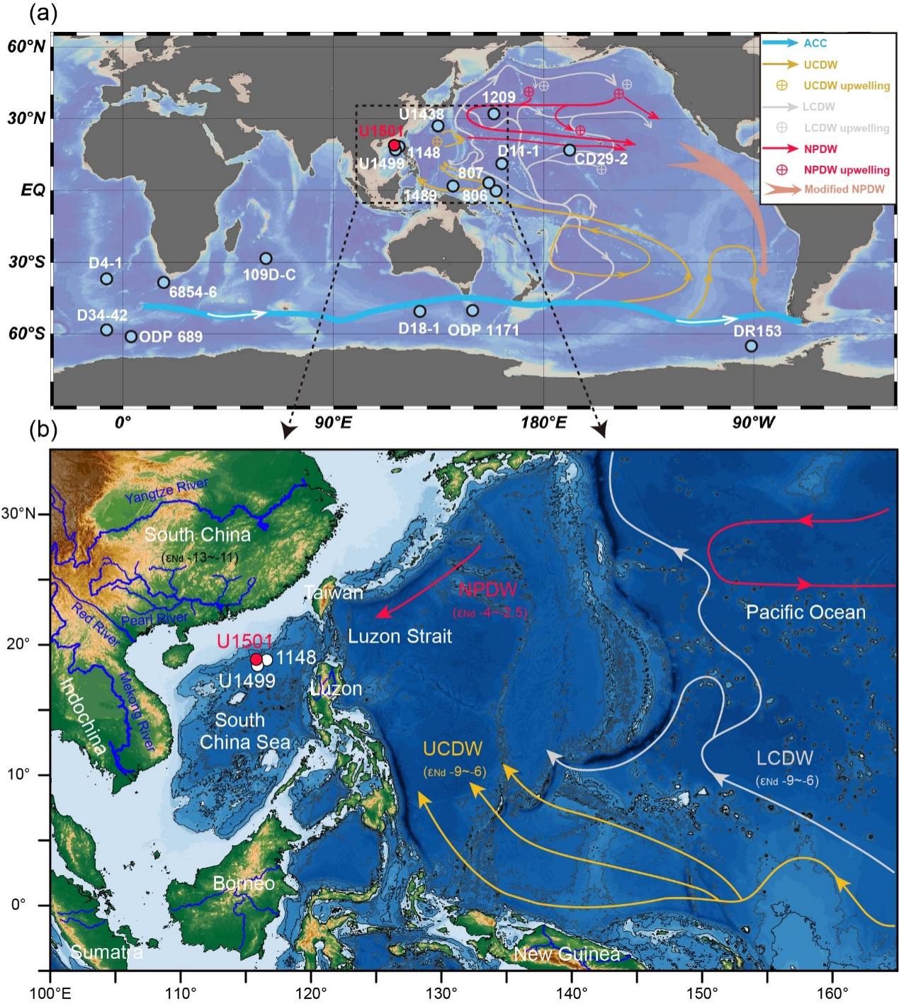 近日,國際地學(xué)期刊Geophysical Research Letters《地球物理研究通訊》(Nature Index)在線刊發(fā)了中國科學(xué)院海洋研究所萬世明研究團(tuán)隊(duì)在晚新生代西太平洋島弧風(fēng)化方面的最新研究成果。研究團(tuán)隊(duì)與法國巴黎薩克雷大學(xué)、同濟(jì)大學(xué)等單位開展合作,基于國際大洋發(fā)現(xiàn)計(jì)劃IODP 368航次在南海北部鉆探獲取的沉積物巖芯,重建了晚漸新世以來南海北部海水釹(Nd)同位素演化歷史。研究發(fā)現(xiàn)晚中新世約9百萬年前以來熱帶西太平洋島弧構(gòu)造活動(dòng)引起的火山巖風(fēng)化顯著增強(qiáng),為晚新生代全球變冷提供了關(guān)鍵的碳匯證據(jù)。