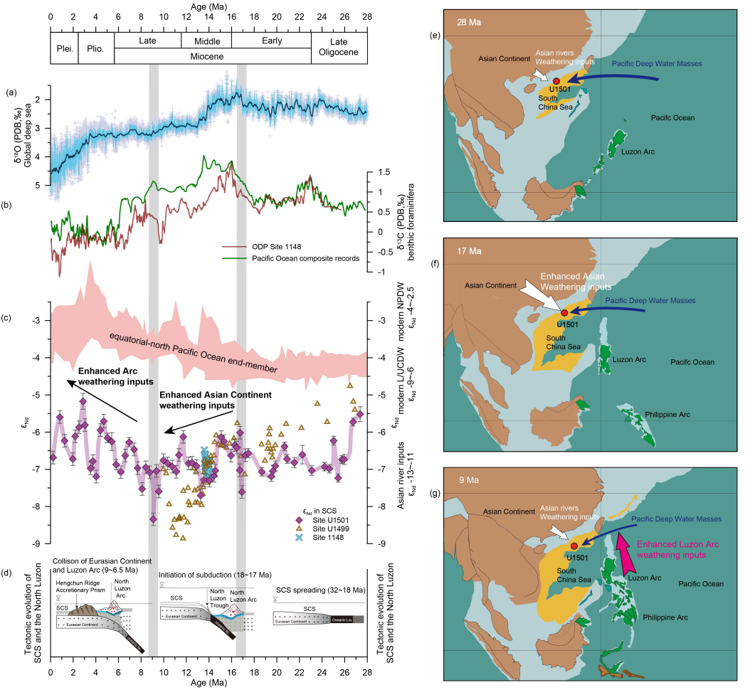 研究結(jié)果表明,自28百萬年前以來南海北部U1501站位海水Nd同位素變化幅度達(dá)3.6個(gè)εNd單位,且呈現(xiàn)明顯的階段性長期變化趨勢。通過與南大洋和太平洋水團(tuán)Nd同位素長期演化記錄,以及西太平洋島弧構(gòu)造演化歷史的綜合對(duì)比,結(jié)果揭示在28~17百萬年期間南海北部海水Nd同位素值接近赤道–北太平洋深水水團(tuán)端元,這和該時(shí)期南海處于開放狀態(tài)、與太平洋深水交換強(qiáng)烈有關(guān)。而在17~9百萬年期間,受菲律賓群島向北逆時(shí)針旋轉(zhuǎn)及南海東部巖石圈向菲律賓海板塊俯沖的影響,呂宋海峽逐漸形成,南海與太平洋深水交換由此受限。與此同時(shí),因青藏高原隆升及東亞夏季風(fēng)增強(qiáng)驅(qū)動(dòng),華南大陸向南海的陸源物質(zhì)輸入通量顯著增加。因此,該時(shí)期逐漸減弱的太平洋水團(tuán)侵入,疊加增強(qiáng)的東亞大陸陸源物質(zhì)輸入,共同導(dǎo)致研究站位Nd同位素顯著負(fù)偏。此后,約9百萬年前以來,呂宋島弧與歐亞大陸的弧陸碰撞加劇,導(dǎo)致東南亞島弧快速隆升與火山巖廣泛暴露風(fēng)化,從而向西太平洋及南海輸入更多放射性Nd,最終引起研究站位海水Nd同位素顯著正偏。