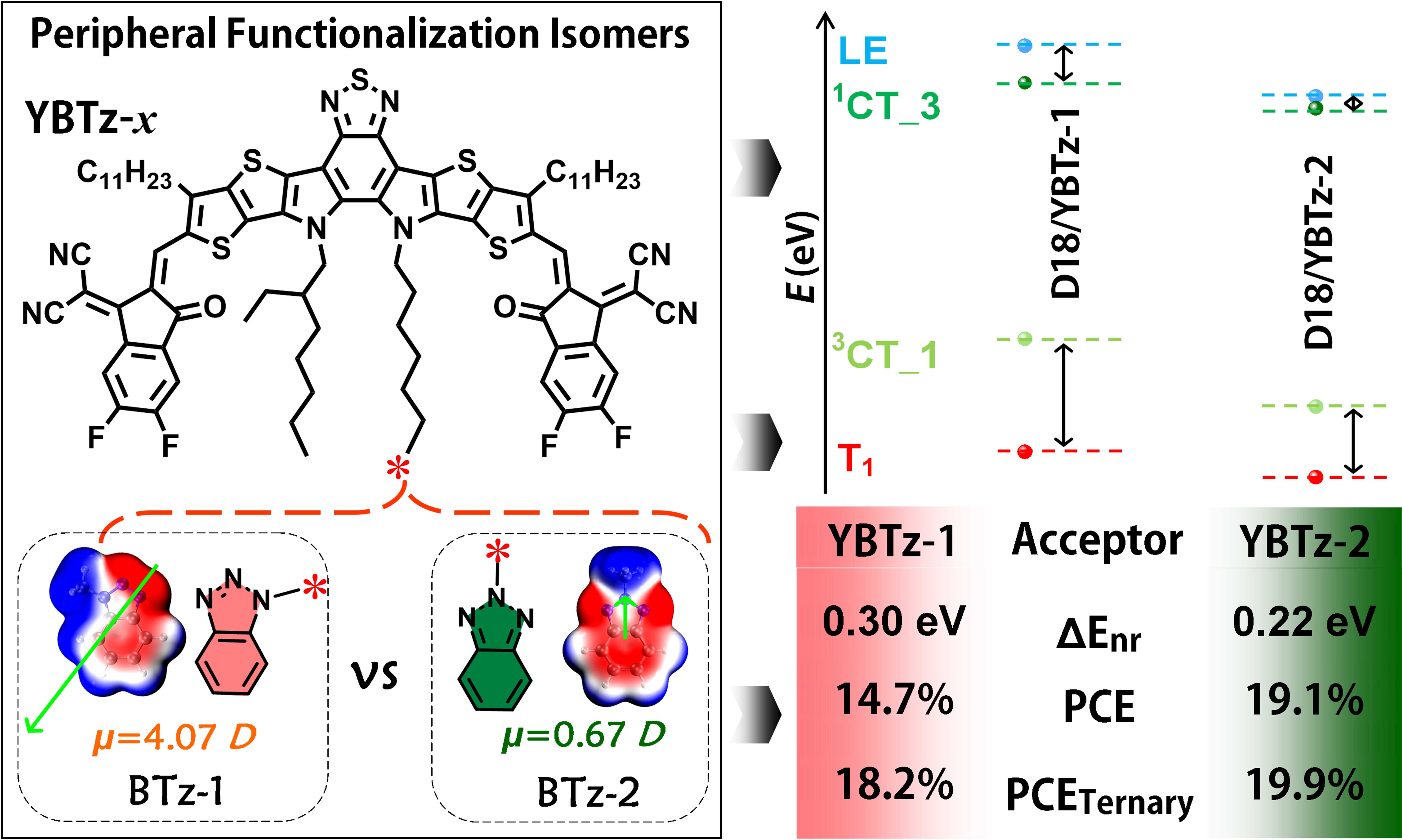 此前研究主要采用苯基作為外圍功能基團調(diào)控有機共軛分子的聚集態(tài)。苯基作為一種整體呈現(xiàn)弱電負(fù)性的共軛基團,其更多發(fā)揮位阻作用,調(diào)節(jié)分子自組裝,同時作為共軛平面參與分子間π-π作用構(gòu)建及空間超共軛效應(yīng)。為了進一步明確描述分子外圍強電子效應(yīng)的功能特性,研究團隊引入具有強電負(fù)性的苯并三氮唑(BTz)進行外圍功能調(diào)控,并基于一鍋法得到了兩類BTz異構(gòu)體(圖1)。研究結(jié)果不僅證實了外圍基團對分子堆積、給受體相互作用及共混形貌的多重影響,還揭示了外圍缺電子基團通過分子內(nèi)相互作用誘導(dǎo)主骨架電子云分布重排,進而顯著調(diào)控異質(zhì)結(jié)能量景貌及非輻射能量損失(ΔEnr)的作用機制。由于ΔEnr的顯著差異(0.30 eV vs 0.22 eV),兩個外懸異構(gòu)化的受體分子YBTz-1和YBTz-2表現(xiàn)出明顯不同的光伏性能(14.7% vs 19.1%)。同時,YBTz-2受體的低非輻射能損特性使其在多組分器件中具有很好應(yīng)用。將YBTz-2進行摻雜后,可以在保持開路電壓基本不變的前提下,顯著改善三組分異質(zhì)結(jié)的納米形貌,同時提高器件的短路電流密度和填充因子,實現(xiàn)了19.9%的高轉(zhuǎn)換效率。