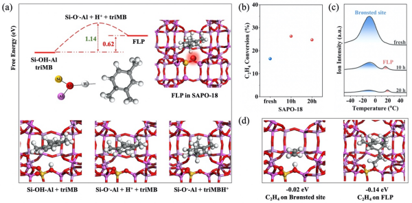 該研究發(fā)現(xiàn),分子篩內(nèi)酸強度較弱的Br?nsted酸位點可以將H+轉(zhuǎn)移到鄰近的碳物種上,可使Si-O--Al為路易斯堿、碳正離子為路易斯酸;空間鄰近的路易斯酸堿位點之間受到靜電吸引作用和空間位阻的排斥作用,形成受阻路易斯酸堿對。