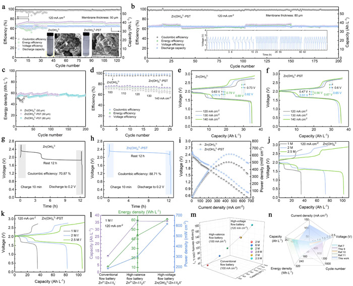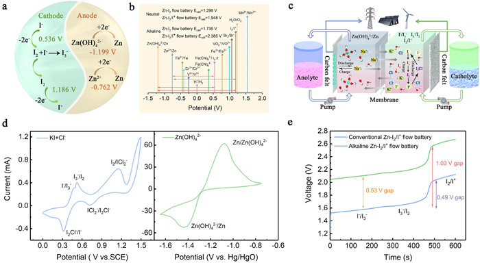 近日,中國科學(xué)院金屬研究所腐蝕基礎(chǔ)與前沿研究部腐蝕電化學(xué)課題組唐奡研究員和李瑛研究員,在高性能鋅碘液流電池研究方面取得重要進(jìn)展。研究團(tuán)隊(duì)創(chuàng)新性提出鋅負(fù)極堿性電解液環(huán)境與碘正極多電子轉(zhuǎn)移路徑協(xié)同優(yōu)化策略,通過構(gòu)建Zn(OH)42?/Zn負(fù)極與I?/I2/I+正極,成功研制出開路電壓達(dá)2.385 V的鋅碘液流電池(圖1),對發(fā)展高能量密度電池具有重要理論和實(shí)踐意義,相關(guān)成果以《A high-voltage alkaline zinc-iodine flow battery enabled by a dual-functional electrolyte additive strategy》為題,發(fā)表于《Advanced Functional Materials》,博士生楊靜為論文第一作者。