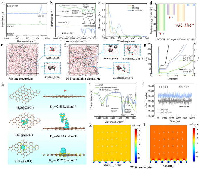 該研究在設(shè)計(jì)高電壓鋅碘液流電池基礎(chǔ)上,通過在堿性鋅負(fù)極添加同時(shí)具備含氧功能性官能團(tuán)以及電荷載體的酒石酸鉀鈉,實(shí)現(xiàn)了對電解液離子結(jié)構(gòu)-電極界面?zhèn)髻|(zhì)行為的有效調(diào)控,電池輸出功率密度達(dá)到了616 mW cm?2,有效提升了22.8%,并在140 mA cm?2電密運(yùn)行下實(shí)現(xiàn)了71.5%的能量轉(zhuǎn)換效率。更重要的是,2.5 M高濃度電解液可在120 mA cm?2下有效提升容量及能量密度至105.98 Ah L?1和185.18 Wh L?1(圖2)。材料表征結(jié)果表明,酒石酸鉀鈉顯著調(diào)控了鋅離子的原始配位平衡,加速了脫溶劑化過程。同時(shí),酒石酸鉀鈉在電極表面優(yōu)先吸附形成屏蔽層,均勻誘導(dǎo)了鋅離子遷移通量,優(yōu)化了電流密度分布,克服了枝晶生長及死鋅累積的缺陷。此外,酒石酸鉀鈉通過氫鍵相互作用破壞了水分子間的原始?xì)滏I網(wǎng)絡(luò),減少了電解液中自由水的數(shù)量,顯著抑制了析氫副反應(yīng)(圖3)。本研究通過理論計(jì)算與多尺度表征技術(shù)聯(lián)用,從分子-介觀-宏觀多維度揭示了界面?zhèn)髻|(zhì)過程與反應(yīng)動力學(xué)的協(xié)同優(yōu)化機(jī)制,為新一代液流電池技術(shù)中高可逆金屬負(fù)極的工程化開發(fā)與應(yīng)用提供了新的技術(shù)路徑以及理論指導(dǎo)。