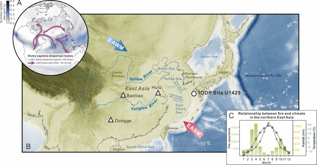 黑碳是生物質(zhì)及化石燃料燃燒過程中所生成的一系列含碳化合物的統(tǒng)稱。鑒于其芳香族結(jié)構(gòu)具備高度穩(wěn)定性,黑碳能夠在沉積環(huán)境中得以長期留存。以大河作為主要沉積物源區(qū)的邊緣海,其沉積物中的黑碳很大程度上能夠反映大陸尺度的火活動狀況。尤為關(guān)鍵的是,大河流域是人類文明孕育與發(fā)展的重要區(qū)域,人類在河流流域內(nèi)的火活動所產(chǎn)生的信號,能夠被黑碳記錄下來并最終被輸送至邊緣海中沉積下來?;诖?,本研究依托來自東海東北部國際綜合大洋鉆探計劃(IODP)U1429站位沉積物中的黑碳記錄(圖1),成功重建了過去30萬年以來東亞北部的古火演化歷史。