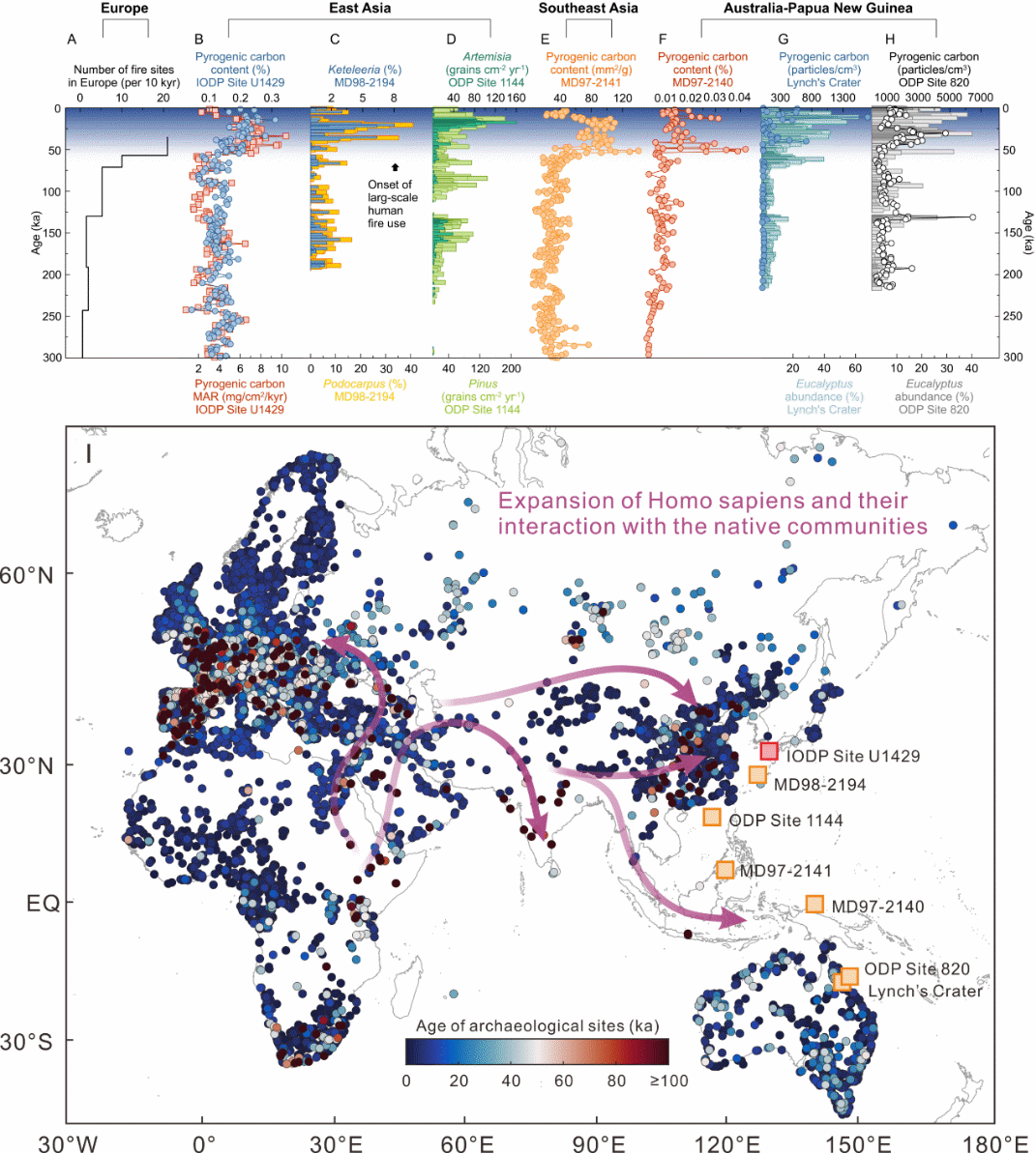 研究結(jié)果顯示,在30萬至5萬年前這一時段內(nèi),東亞季風(fēng)氣候是主導(dǎo)古火演化的關(guān)鍵因素,冷干氣候時期火活動更強(qiáng),暖濕期則較弱。然而,自5萬年前至今,火強(qiáng)度出現(xiàn)了大幅升高的現(xiàn)象,呈現(xiàn)出與季風(fēng)氣候脫耦的趨勢。這一變化正好對應(yīng)了東亞地區(qū)人口的急劇擴(kuò)張時期,表明人類大規(guī)模用火所產(chǎn)生的顯著影響(圖2)。研究進(jìn)一步對全球其他區(qū)域的古火證據(jù)進(jìn)行了綜合對比,發(fā)現(xiàn)5萬年前在歐洲、東南亞以及巴布亞新幾內(nèi)亞-澳大利亞等地區(qū),均出現(xiàn)了火強(qiáng)度急劇升高的現(xiàn)象(圖3)。研究認(rèn)為,5萬年前的冰期,現(xiàn)代人類開啟了第二次走出非洲的遷徙歷程。冰期海平面下降,印太暖池區(qū)大面積的陸架出露為陸地,雨林屏障作用減弱,使得人類在不到一萬年的時間里就迅速擴(kuò)散至東亞、東南亞乃至澳大利亞(圖3)。人口的急劇擴(kuò)張極大地促進(jìn)了用火頻率的上升。此外,冰期氣候寒冷,食物資源相對匱乏,人類對用火的需求也隨之大幅增加。這些因素最終共同促成了5萬年前人類開始大規(guī)模用火的關(guān)鍵時間節(jié)點。這也進(jìn)一步表明,人類可能在末次冰期就已經(jīng)通過用火在全球碳循環(huán)演變中留下了深刻的印記。