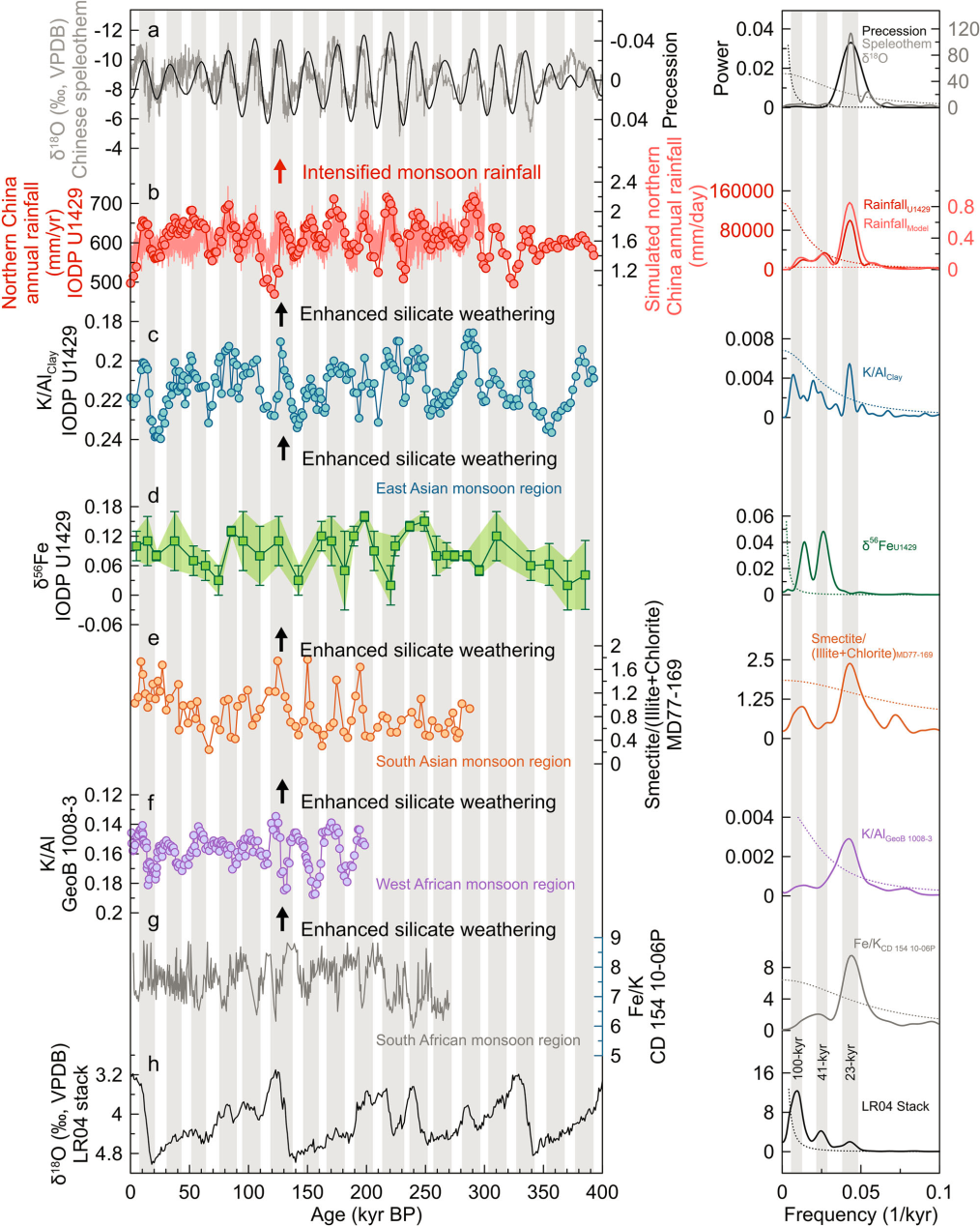 圖1 晚第四紀以來全球硅酸鹽風化記錄以及降水演變周期的強度分布