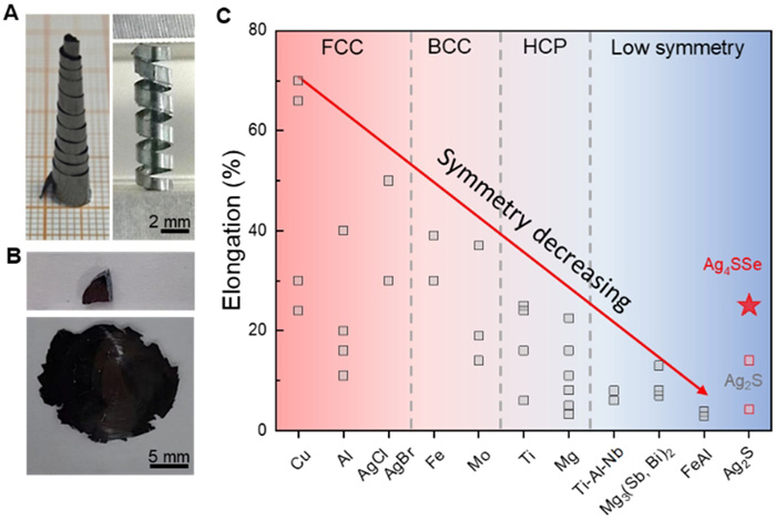 相關(guān)發(fā)現(xiàn)闡明了低對稱性Ag?S基多晶半導(dǎo)體塑性變形的微觀結(jié)構(gòu)機(jī)制,為探索新型塑性半導(dǎo)體、豐富物質(zhì)塑性變形理論打下了基礎(chǔ)。