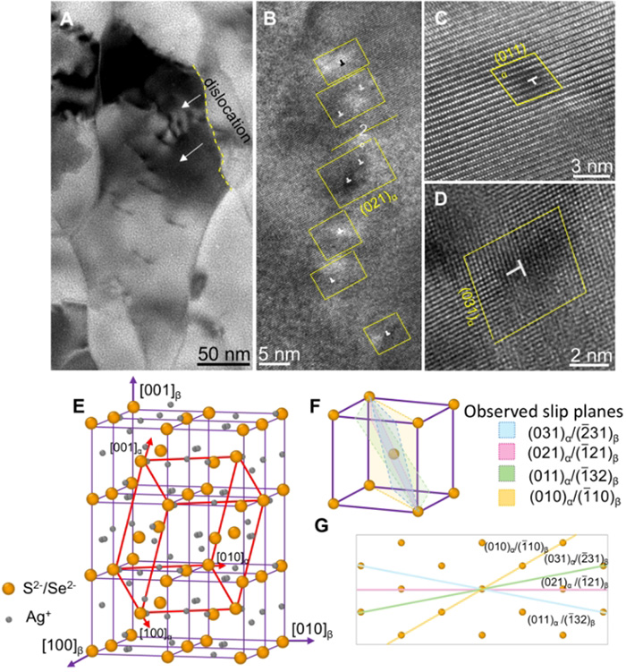 Ag?SSe單斜結(jié)構(gòu)多晶半導(dǎo)體具有優(yōu)異的室溫塑性,其拉伸、彎曲和壓縮應(yīng)變分別可達(dá)25%、40%和50%,甚至可以塑性加工成具有優(yōu)良性能的半導(dǎo)體彈簧。研究發(fā)現(xiàn),其單斜結(jié)構(gòu)中隱含了一個(gè)準(zhǔn)體心立方(quasi-BCC)結(jié)構(gòu)的高對稱性陰離子亞晶格,進(jìn)而具有多個(gè)可開動(dòng)滑移系,有效促進(jìn)了塑性變形。團(tuán)隊(duì)利用高分辨透射電鏡,在劇烈塑性變形后的樣品中清晰觀測到了單斜結(jié)構(gòu)4個(gè)滑移面,(011)、(021)、(031)和(010)分別對應(yīng)準(zhǔn)立方結(jié)構(gòu)中典型的(