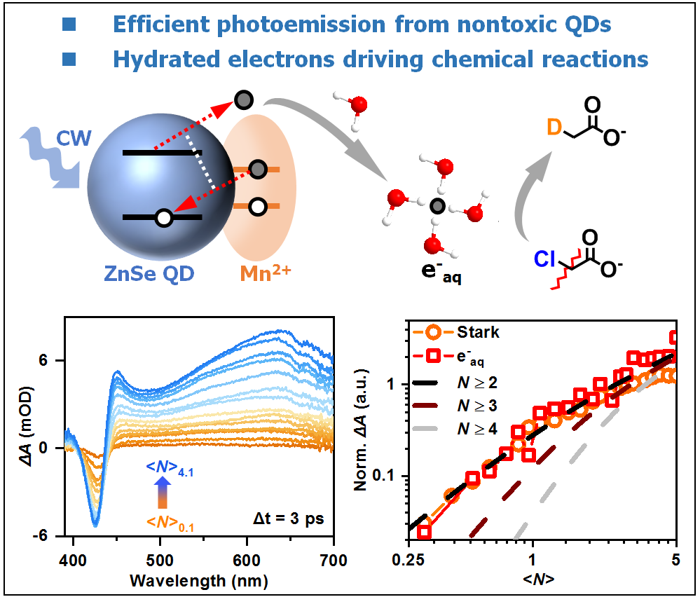 近日,大連化物所化學(xué)動(dòng)力學(xué)研究室光電材料動(dòng)力學(xué)研究組吳凱豐研究員團(tuán)隊(duì)在量子點(diǎn)超快光物理與光化學(xué)研究中取得新進(jìn)展,開發(fā)了錳摻雜的硒化鋅(ZnSe)量子點(diǎn),用于驅(qū)動(dòng)水合電子的高效生成,并將其應(yīng)用于有機(jī)光催化反應(yīng)中。