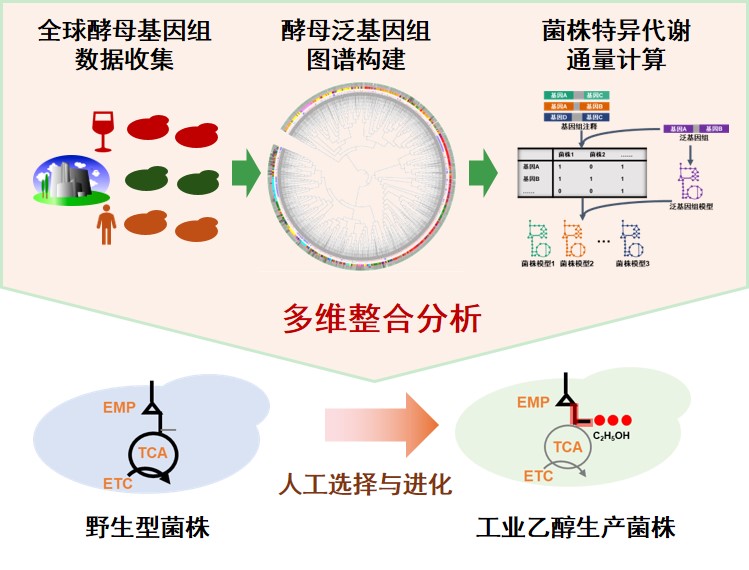 本研究創(chuàng)建了高質(zhì)量酵母泛基因組與菌株特異性代謝模型數(shù)字資源庫?;诖耍瑘F(tuán)隊(duì)建立了“泛基因組-代謝模型-多組學(xué)整合”的多維度分析流程,為從系統(tǒng)層面理解微生物的環(huán)境適應(yīng)性及代謝特性提供了新理論框架。以工業(yè)乙醇生產(chǎn)菌株為例,團(tuán)隊(duì)從基因、轉(zhuǎn)錄及代謝通量三個(gè)維度證實(shí),強(qiáng)化糖酵解下游途徑與乙醇的高效合成密切相關(guān),該發(fā)現(xiàn)為后續(xù)乙醇及其衍生物細(xì)胞工廠的理性設(shè)計(jì)提供了重要線索。