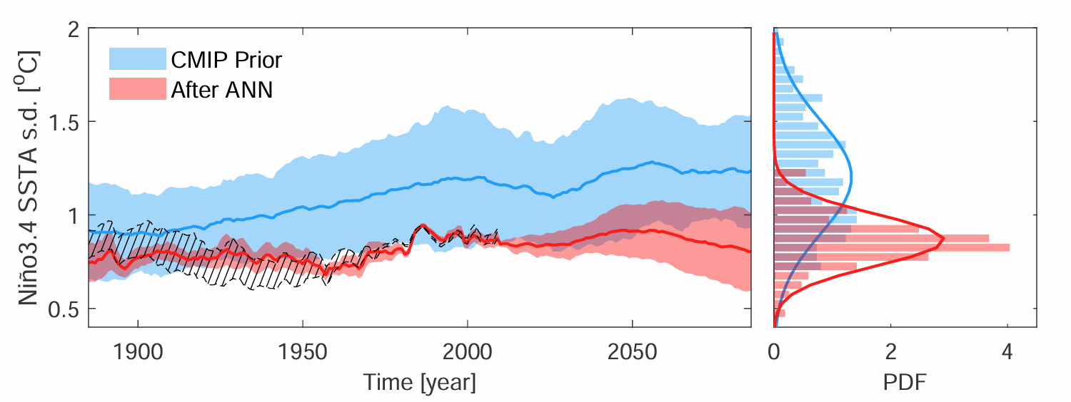 為突破這一瓶頸,研究團(tuán)隊設(shè)計了一種“observation-informed”深度學(xué)習(xí)方法。研究人員利用多個CMIP6氣候模式的歷史和未來情景數(shù)據(jù),訓(xùn)練了11個獨立的人工神經(jīng)網(wǎng)絡(luò)(ANN)模型,目標(biāo)是學(xué)習(xí)每個模式中ENSO變率與熱帶太平洋平均海溫狀態(tài)之間的復(fù)雜關(guān)系。隨后,團(tuán)隊引入真實觀測數(shù)據(jù)對這些ANN進(jìn)行驗證和篩選,特別關(guān)注那些能夠準(zhǔn)確捕捉觀測到的ENSO對海溫變化響應(yīng)的ANN(如基于GISS-E2-1-H模型訓(xùn)練的ANN)。通過可解釋性分析和ENSO物理機(jī)制(如Bjerknes穩(wěn)定性指數(shù)和ENSO非線性)檢驗,研究證實表現(xiàn)優(yōu)異的ANN成功內(nèi)化了真實的ENSO物理過程,尤其對赤道中太平洋和遠(yuǎn)東太平洋的海溫變化高度敏感,這與已知的ENSO關(guān)鍵反饋區(qū)域一致。利用ANN對高排放情景(SSP5-8.5)下21世紀(jì)ENSO海溫變率進(jìn)行約束性預(yù)估。結(jié)果表明,相較于原始CMIP模式預(yù)測結(jié)果,經(jīng)ANN約束的預(yù)測不確定性范圍降低了54%。