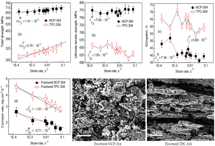 圖2. 應(yīng)變速率對(duì)拉伸(納米晶和普通304不銹鋼)和腐蝕(拉斷后的納米晶和普通304不銹鋼)性能的影響
