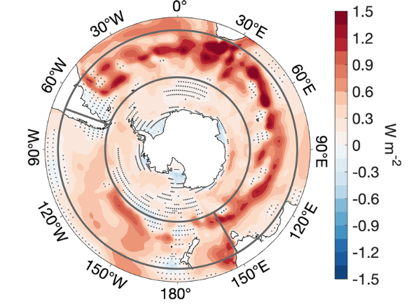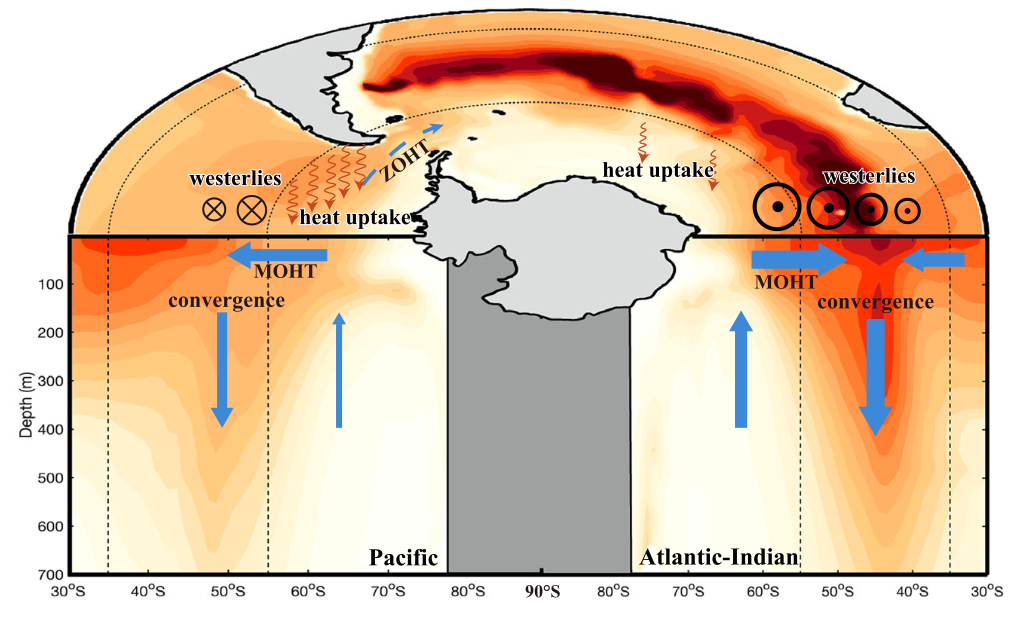 自20世紀(jì)中期以來,地球系統(tǒng)因溫室氣體累積而吸收的多余熱量超過90%被儲存在海洋中。其中,南大洋(Southern Ocean)對全球海洋熱儲的貢獻(xiàn)達(dá)60%,是全球氣候系統(tǒng)變化的“熱量閥門”。它的持續(xù)變暖不僅影響南極冰架融化、全球海平面上升,還深刻改變深層水體形成、海洋碳吸收能力與海洋生態(tài)系統(tǒng)。過去的研究普遍采用緯向平均的方法,描繪出南大洋以45°S為中心的經(jīng)向(南北向)升溫結(jié)構(gòu):靠近南極的高緯海區(qū)吸熱后,熱量被風(fēng)驅(qū)動的經(jīng)向流輸送至中緯度海區(qū)。但南大洋增暖的緯向結(jié)構(gòu)仍不清楚。