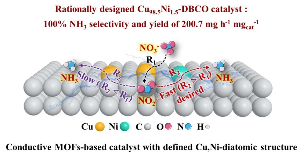 近日,大連化物所太陽(yáng)能研究部太陽(yáng)能制儲(chǔ)氫材料與催化研究組(DNL1621組)章福祥研究員團(tuán)隊(duì)聯(lián)合計(jì)算和數(shù)據(jù)驅(qū)動(dòng)催化研究組(511組)肖建平研究員團(tuán)隊(duì),在雙原子電催化劑(DACs)的理性設(shè)計(jì)與構(gòu)筑方面取得新進(jìn)展。研究團(tuán)隊(duì)基于具有優(yōu)異導(dǎo)電性和水穩(wěn)定性的金屬有機(jī)框架材料(conductive MOF,cMOF),通過對(duì)銅-鎳(Cu-Ni)雙原子活性中心的精準(zhǔn)調(diào)控,實(shí)現(xiàn)了在工業(yè)級(jí)電流密度下接近100%選擇性地高效合成氨,并揭示了硝酸根電還原合成氨過程中的協(xié)同“接力催化”機(jī)制。