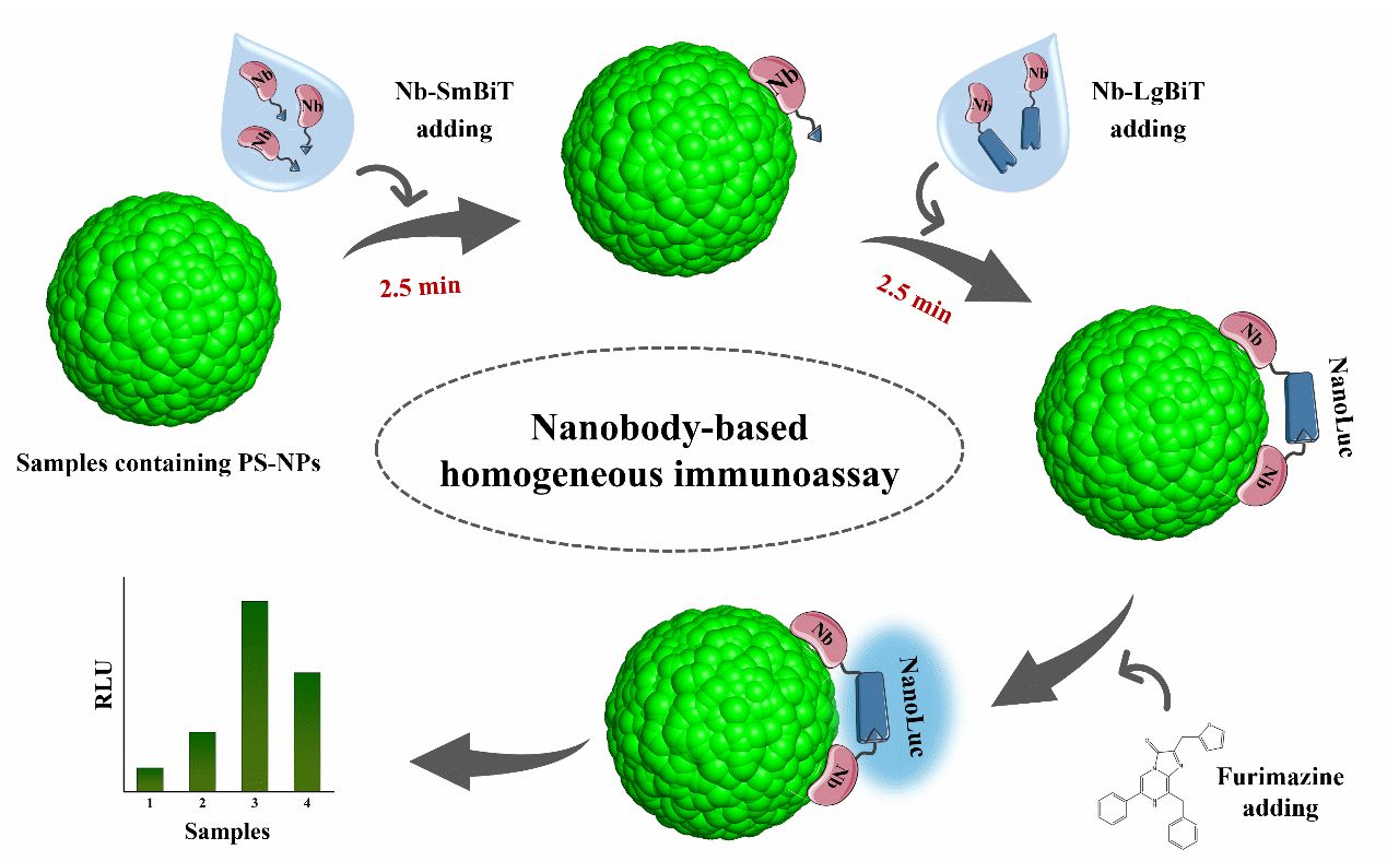 針對上述問題,青島能源所蛋白質材料研究組立足前期研究基礎,依托篩選獲得的高親和力聚苯乙烯結合納米抗體B2,構建融合分裂型納米熒光素酶亞基(SmBiT/LgBiT)的雙功能探針,開發(fā)出一種基于納米抗體與分裂熒光素酶技術的均相免疫分析方法,成功實現(xiàn)對20納米聚苯乙烯納米塑料的高靈敏、快速定量檢測。其核心原理為當分別標記SmBiT和LgBiT的B2探針同時結合在同一納米塑料表面時,分裂的熒光素酶亞基發(fā)生互補重構,產(chǎn)生可定量檢測的發(fā)光信號,以此實現(xiàn)對目標納米塑料的精準識別與定量分析,為環(huán)境納米塑料污染溯源、風險評估與監(jiān)管決策提供了重要技術支撐。