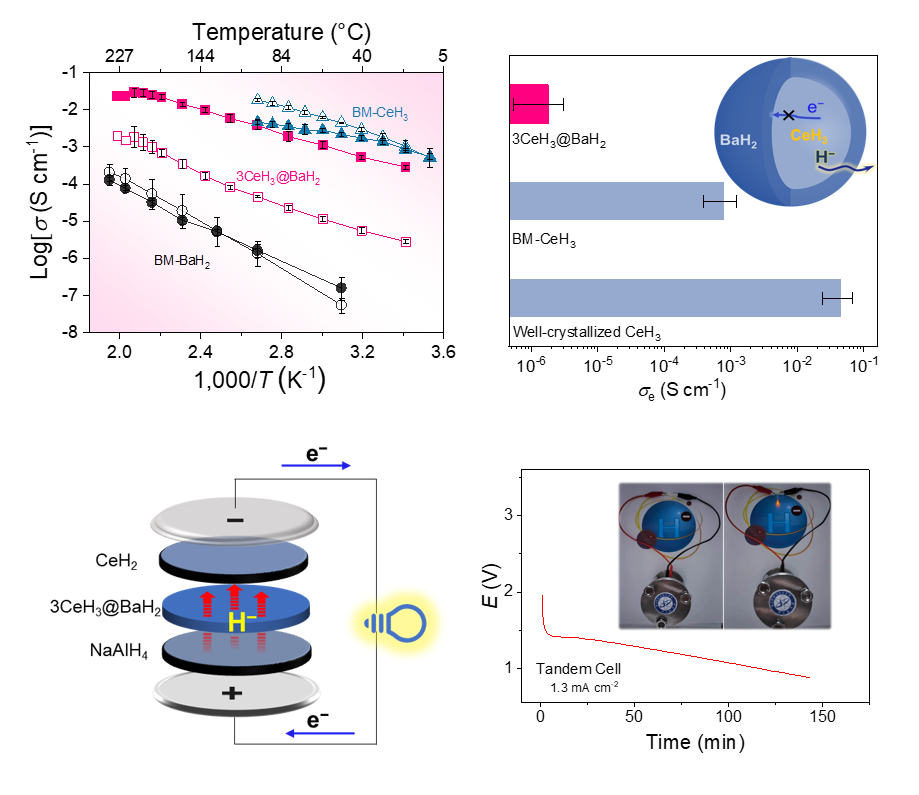 氫負(fù)離子(H?)是氫原子獲得一個電子后形成的陰離子,具有質(zhì)量輕、氧化還原電位高(H?/H2,–2.3 V vs SHE)等特性,被認(rèn)為是發(fā)展新型電化學(xué)器件的重要載流子,在推動二次電池、燃料電池、電解池等技術(shù)革新方面展現(xiàn)出重要應(yīng)用潛力。然而,由于缺乏能同時滿足高離子電導(dǎo)率、低電子電導(dǎo)率、優(yōu)良熱穩(wěn)定性和電化學(xué)穩(wěn)定性,以及與電極材料良好兼容性的電解質(zhì)材料,迄今為止,氫負(fù)離子二次電池技術(shù)始終未能實(shí)現(xiàn)突破。因此,開發(fā)綜合性能優(yōu)異的氫負(fù)離子導(dǎo)體材料被視為固態(tài)離子學(xué)和氫能領(lǐng)域的前沿課題。