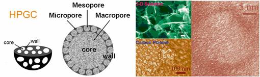 該研究組研究了在多孔炭電極中發(fā)生的基本電化學(xué)過程(J. Phys. Chem. B 2006, 110, 8570-8575),發(fā)現(xiàn)多孔電極的電荷存儲(chǔ)能力由多孔結(jié)構(gòu)的離子傳輸性能(受孔的尺寸、形狀及取向等因素影響)、多孔炭的電子導(dǎo)電性以及電解液性質(zhì)和電解液與炭材料之間的物理化學(xué)相互作用等因素所決定。據(jù)此他們提出將不同尺度孔(大孔-中孔-微孔)以三維網(wǎng)絡(luò)形式組裝,同時(shí)盡可能獲得局域石墨片層結(jié)構(gòu)的電極材料設(shè)計(jì)思想。其設(shè)計(jì)原理是:局域石墨化三維層次多孔結(jié)構(gòu)(HPGC結(jié)構(gòu))可充分利用大孔結(jié)構(gòu)作為準(zhǔn)體相的電解液儲(chǔ)存池以縮短離子擴(kuò)散距離,中孔結(jié)構(gòu)提供快速的離子輸運(yùn)通道,大孔-中孔協(xié)同作用可實(shí)現(xiàn)電解液離子在多孔炭電極中的準(zhǔn)體相快速擴(kuò)散行為;微孔的高靜電吸附容量賦予優(yōu)異的電化學(xué)儲(chǔ)能活性;局域石墨片層則能夠提高材料本體的電子導(dǎo)電性(參見圖1)。HPGC結(jié)構(gòu)可有效增加離子可利用的電化學(xué)活性表面積和電化學(xué)活性,并顯著降低大電流導(dǎo)致的電位極化,從而獲得在高倍率條件下高能量/高功率密度的電化學(xué)能量存儲(chǔ)與轉(zhuǎn)換能力。
