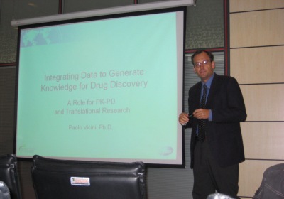 楊凌研究員主持了交流會(huì),他首先向與會(huì)人員介紹了Pfizer全球研發(fā)的兩位專家及其研究背景。Dr. Paolo Vicini首先做了題為”Integrating Data to Generate Knowledge for Drug Discovery:A Role for PK-PD and Translational Research”的主題報(bào)告。李國輝研究員、張延延博士和房中則博士代表各自研究組分別就“藥物虛擬設(shè)計(jì)與靶點(diǎn)模擬”、“In silico-in vitro-ex vivo-in vivo整合藥代動(dòng)力學(xué)研究新平臺(tái)”及“臨床用藥早期ADME/T性質(zhì)評價(jià)”做了最新研究進(jìn)展報(bào)告。全體參會(huì)人員圍繞早期ADME、PBPK以及PK/PD等核心、熱點(diǎn)及前沿問題展開了深入的討論。此后,兩位客人參觀了生物技術(shù)部鄒漢法研究員、張麗華研究員及楊凌研究員的研究組,并對大連化物所相關(guān)領(lǐng)域的最新技術(shù)和進(jìn)展表現(xiàn)出了濃厚的興趣。