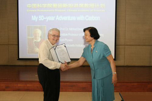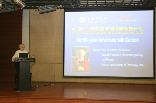 來(lái)訪期間,Dresselhaus教授參觀了沈陽(yáng)材料科學(xué)國(guó)家(聯(lián)合)實(shí)驗(yàn)室和鈦合金研究部,并作了題目為“My 50-year Adventure with Carbon”的精彩學(xué)術(shù)報(bào)告,她從愛(ài)因斯坦的學(xué)術(shù)生涯講起,然后講述了她自身在炭材料領(lǐng)域探索50年的科研經(jīng)歷,向金屬所科研人員和研究生展示了炭材料的發(fā)展歷程,受到了大家的好評(píng),會(huì)場(chǎng)不時(shí)響起掌聲和笑聲。金屬所、哈爾濱工業(yè)大學(xué)、鞍山科技大學(xué)等300多名科研人員、教師和研究生懷著極大的興趣參加了報(bào)告會(huì)。