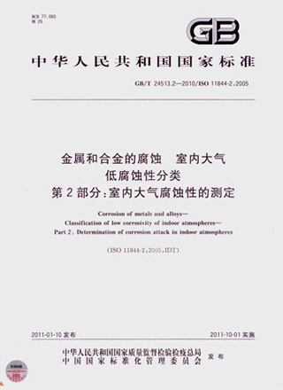 有別于戶外大氣,室內(nèi)大氣有其特殊性,它與室內(nèi)生產(chǎn)環(huán)境、擺放物體或設(shè)備有關(guān),也存在不同程度的腐蝕性。目前我國室內(nèi)大氣低腐蝕性分類方面國家標(biāo)準(zhǔn)尚屬空白,因此急需在引進(jìn)、消化、吸收國外先進(jìn)技術(shù)標(biāo)準(zhǔn)的基礎(chǔ)上,結(jié)合我國的實(shí)際需要,制定相應(yīng)的國家標(biāo)準(zhǔn)。《GB/T 24513.2-2010金屬和合金的腐蝕 室內(nèi)大氣低腐蝕性分類 第2部分:室內(nèi)大氣腐蝕性的測定》可表征對金屬和金屬覆蓋層在存儲(chǔ)、運(yùn)輸、安裝或操作使用期間有影響的低腐蝕性的室內(nèi)大氣環(huán)境。該標(biāo)準(zhǔn)根據(jù)標(biāo)準(zhǔn)試樣受到的腐蝕作用來確定室內(nèi)大氣腐蝕性分類,并規(guī)定了適合作為室內(nèi)大氣腐蝕性評價(jià)基礎(chǔ)的重要參數(shù)。